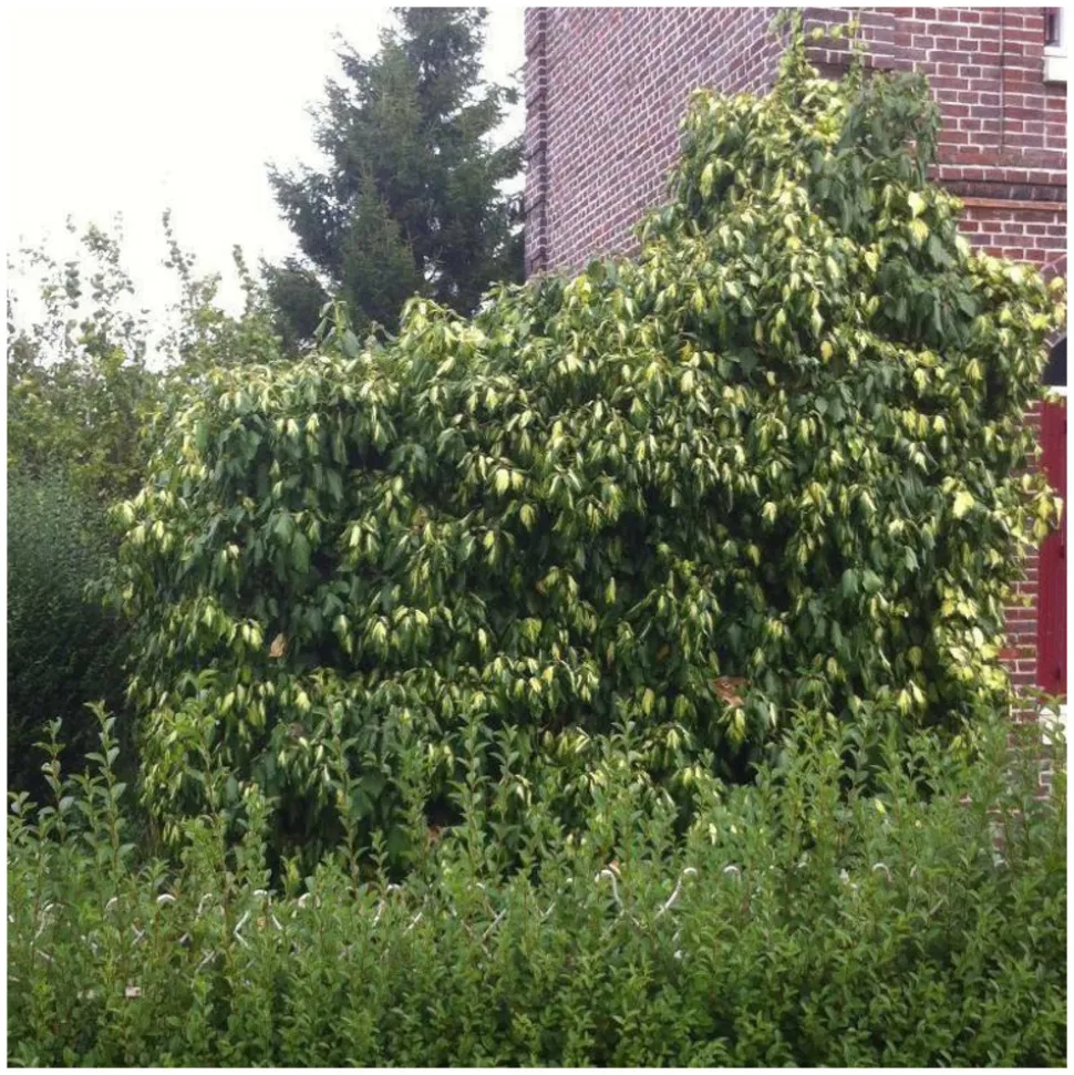 Les feuilles de 15/20 cm sont vertes, éclairées d’une tache jaune-vert claire, d’importance variable selon les feuilles.