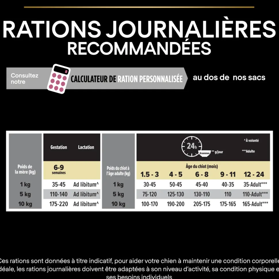 Rations journalières recommandées (g/jour) :Poids à l’âge adulte (kg) Âge du chiot (mois) 1.5-3 4-5 6-8 9-121 50-55 60 60 Adult5 60-85 85-75 75 75-Adult1075-115 120-140 145 145Mode d’emploi : Voir le tableau des rations journalières recommandées (g/jour). Chiennes en gestation ou en lactation : Veuillez vous reporter au site Purina PRO PLAN® ou demander conseil à votre vétérinaire.Sevrage et croissance : Durant la période de sevrage, de l’âge de 3 à 6 semaines, proposez PRO PLAN® Puppy 3 à 4 fois par jour humidifié avec de l’eau.Après le sevrage, suivez les rations journalières du tableau.Au-delà de 3 mois, diminuez progressivement la quantité d’eau ajoutée.Pour une croissance harmonieuse, assurez-vous que votre chiot maintienne une condition corporelle idéale.Les rations journalières doivent être adaptées à son activité, sa condition physique et ses besoins individuels.De l’eau fraîche et propre doit toujours être à la disposition de votre chien.Pour surveiller la santé de votre chien, consultez régulièrement votre vétérinaire.
