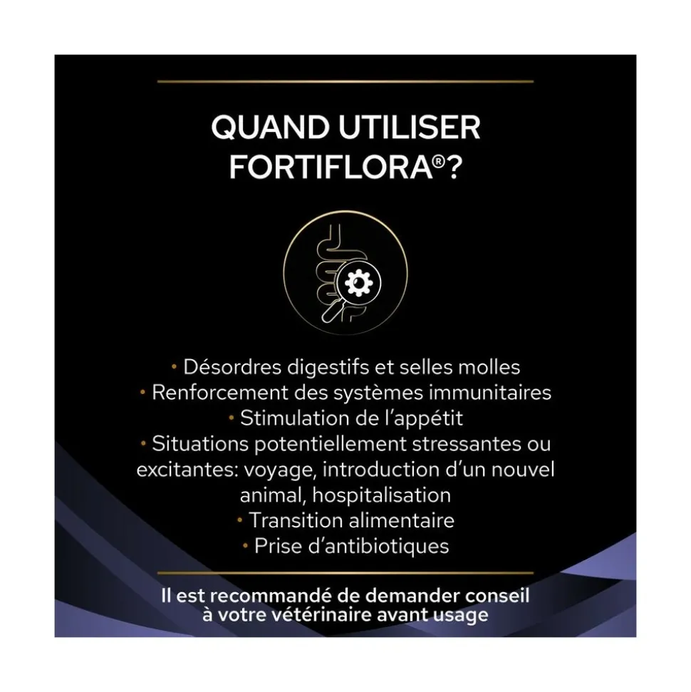 Favorisez le bien-être digestif et la flore intestinale de votre chat avec les FortiFlora Bouchées de Purina Pro Plan Veterinary Diets. Ces friandises complémentaires contiennent un probiotique spécifique (Enterococcus faecium SF68) cliniquement prouvé pour aider à maintenir une digestion saine et un micro‑environnement intestinal équilibré.
