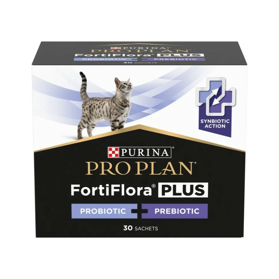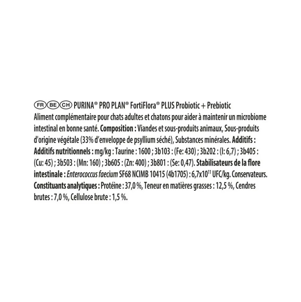 FortiFlora® PLUS est un complément nutritionnel savoureux, formulé par Purina Pro Plan Veterinary Diets pour soutenir la santé digestive et renforcer le système immunitaire des chats dès le sevrage. Il associe une souche probiotique reconnue scientifiquement (Enterococcus faecium SF68) à un prébiotique naturel (psyllium) pour contribuer à un microbiome intestinal équilibré.