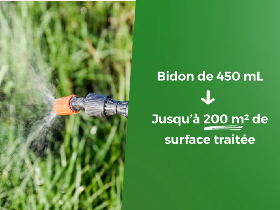 – Désherbage : 22,5 mL / 0,5 L / 10 m², Destruction des mousses : 18 mL / 0,5L / 10 m²