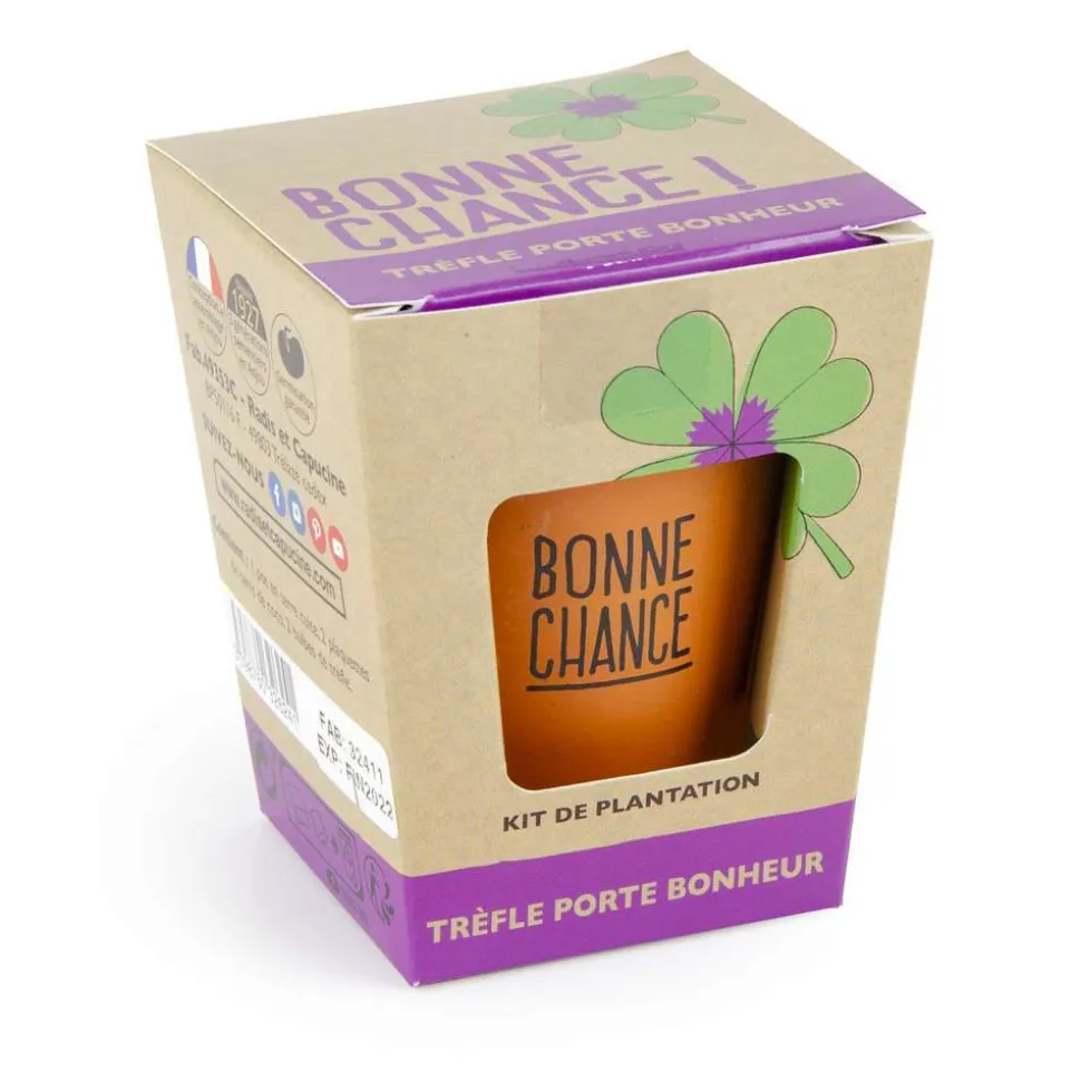 Ce kit renferme tout ce qu’il faut pour faire pousser ses trèfles porte-bonheur à 4 feuilles. Hydratez la pastille de terre de coco fournie dans le kit avec 4 fois son volume d’eau du robinet. Lorsqu’elle est complètement gonflée, la défaire entre les doigts et remplir le pot de terre cuite. Plantez les bulbes de trèfle à 4 feuilles la pointe vers le haut, en les enfonçant peu, on peut même laisser légèrement affleurer la pointe à la surface. Arrosez régulièrement pour maintenir la terre tout juste humide et conserver à l’intérieur.
