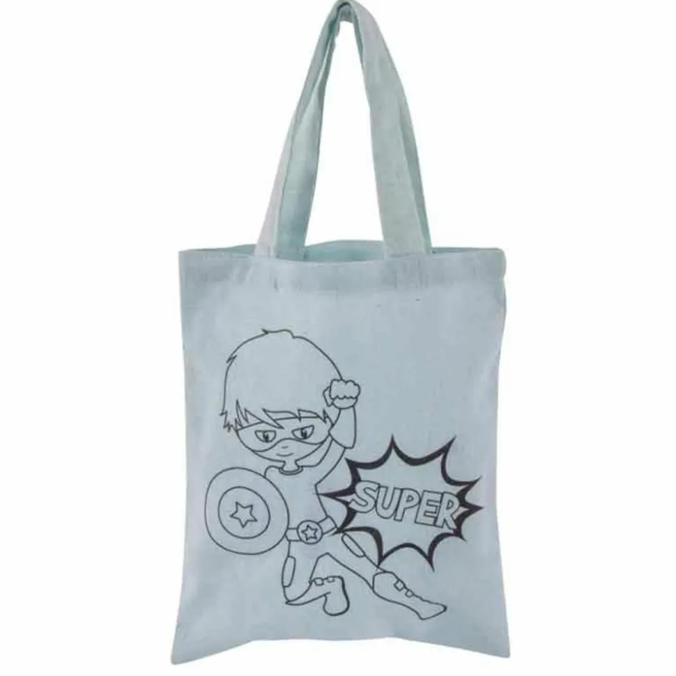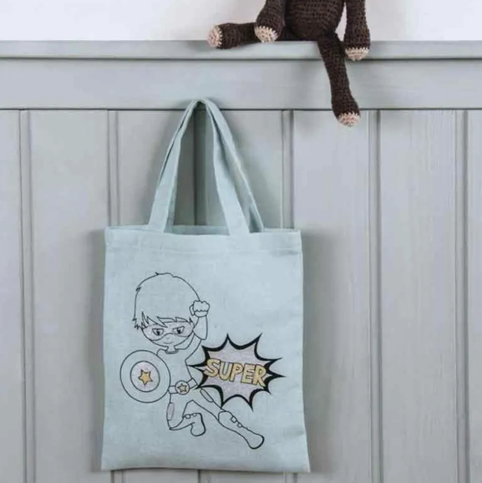 Sac en coton mesurant 25 x 20 avec comme une impression un enfant super héros, vous pouvez le laisser ainsi ou le customiser avec des rubans ou des paillettes pour donner une touche encore plus magique