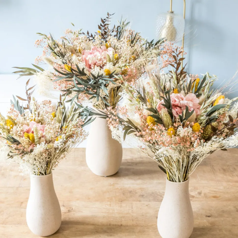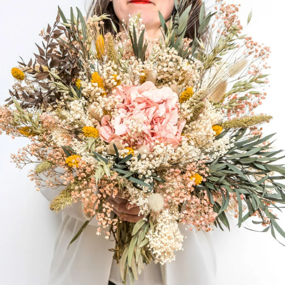 Faites entrer le printemps dans votre intérieur grâce à ce bouquet de fleurs séchées aux couleurs douces et lumineuses. Inspiré par le réveil du printemps, le gypsophile blanc et rose entoure la délicate fleur d’hortensia rose clair. Le phalaris jaune réveille l’ensemble tandis que l’avoine, le blé barbu et le sétaire donne son caractère naturel à ce bouquet de fleurs séchées. Les fines feuilles d’eucalyptus willow et de ruscus brun encadrent ce bouquet pour un résultat délicat et travaillé.Ce bouquet de fleurs séchées est réalisé à la main dans notre atelier de la région parisienne avec des plantes naturelles séchées ou stabilisées à la glycérine végétale. Avantages : longévité, entretien facile, et diversité de couleurs. Nos bouquets sont faits pour durer. Vous pourrez les conserver plusieurs années.Composition du bouquet :– Gypsophile blanc– Gypsophile rose– Eucalyptus willow– Brooms naturel– Phalaris jaune– Blé barbu– Avoine naturel– Lagurus naturel– Hortensia rose– Sétaire naturel– Ruscus brunTaille du bouquet : TAILLE LHauteur : env. 55, Diamètre 35 cmNos conseils d’entretien :Nos bouquets de fleurs séchées sont faits pour durer. En appliquant nos conseils, vous pourrez les conserver de nombreuses années.1. Placez votre bouquet de fleurs séchées à l’abri de la lumière directe du soleil : En effet, une exposition longue et répétée affadira ses couleurs d’origine.2. Méfiez-vous des courants d’air : L’assèchement rend les fleurs beaucoup plus fragiles. Un mouvement brusque ou un courant d’air peut faire s’envoler les pétales de vos fleurs séchées. Pensez-y !.