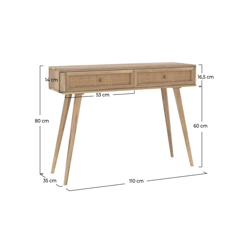 Le bois de manguier, apprécié pour ses riches nuances, se présente ici dans une version brute au coloris clair. Les tiroirs en cannage ajoutent à son authenticité. Les pieds inclinés apportent de la légèreté.