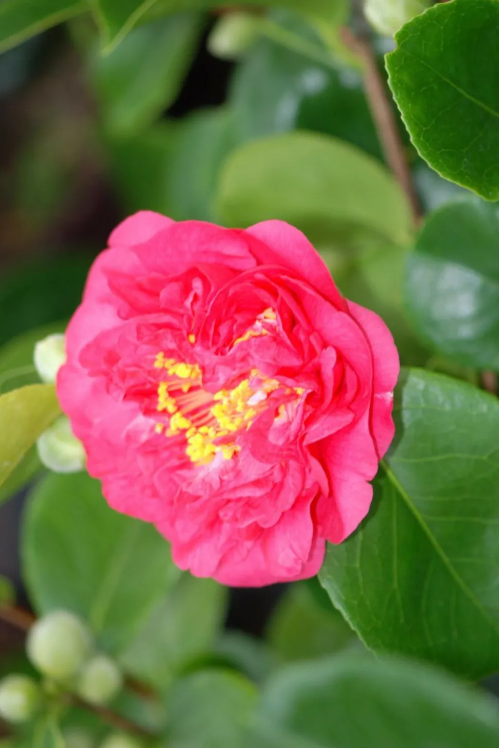 Un camélia est toujours un émerveillement. Cette variété l’est assurément par sa floraison qui intervient alors que l’hiver n’a pas totalement tiré sa révérence. En effet, cette variété de camélia du Japon offre ses premières fleurs semi-doubles, anémoniformes, de février à avril. Et il se montre particulièrement florifère. De très belle taille avec un diamètre de près de 15 cm, ces fleurs au c’ur volanté arborent un magnifique rose vif, rehaussé d’étamines jaune doré, légèrement dispersées. Parfois, quelques petites taches blanches viennent délicatement ponctuer le bord des pétales centraux. Par leur profusion et leur couleur intense, les fleurs de ce camélia apportent littéralement la luminosité qui fait souvent défaut en fin d’hiver.
