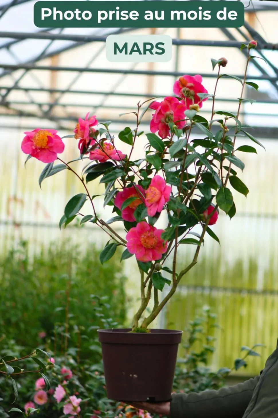 Doté d’un port élégant, compact et érigé, cette variété de camélia reste relativement modeste par ses dimensions. Ses 80 cm de hauteur et 70 cm d’envergure autorisent une plantation en pot sur une terrasse ou un balcon. Mais il se plaira aussi en pleine terre, apportant de la gaieté et de la lumière par sa floraison éclatante à une époque où le jardin semble bien endormi. Il saura résister au froid jusqu’à – 15 C à condition de bénéficier d’un emplacement abrité des grands vents froids.