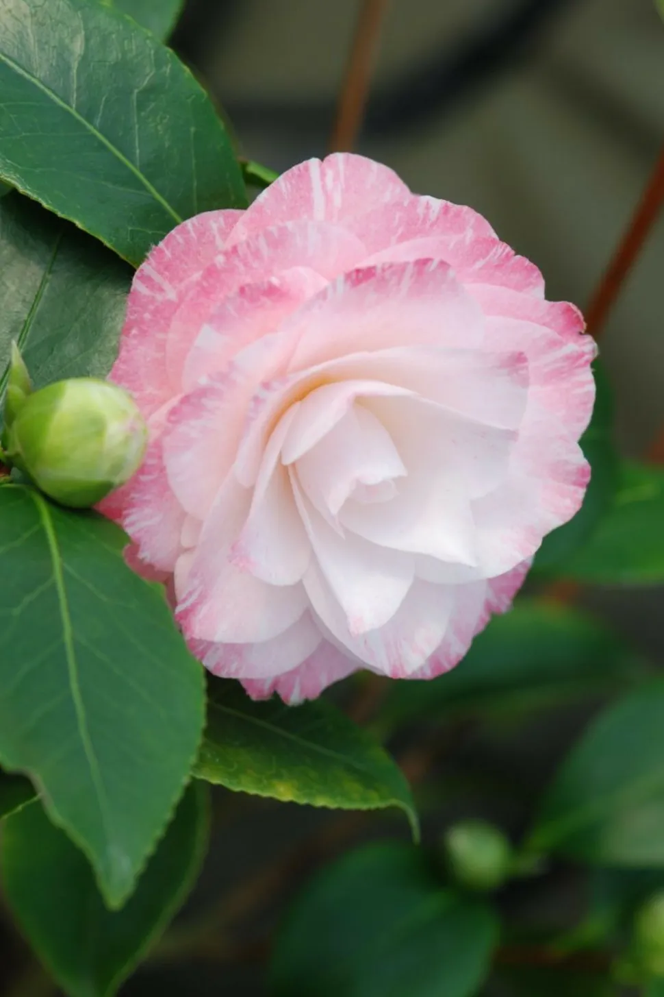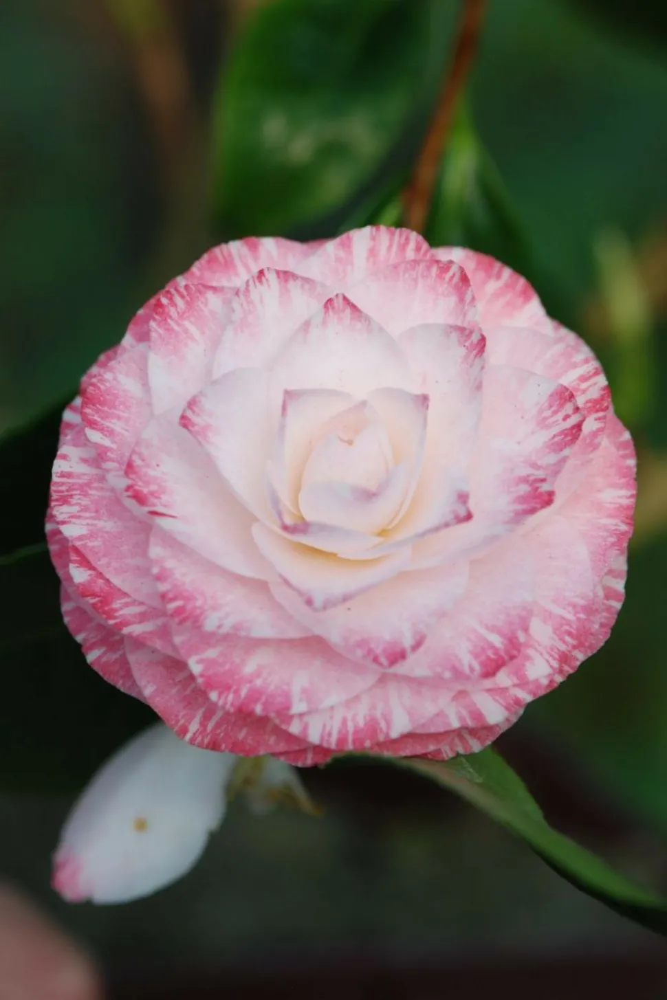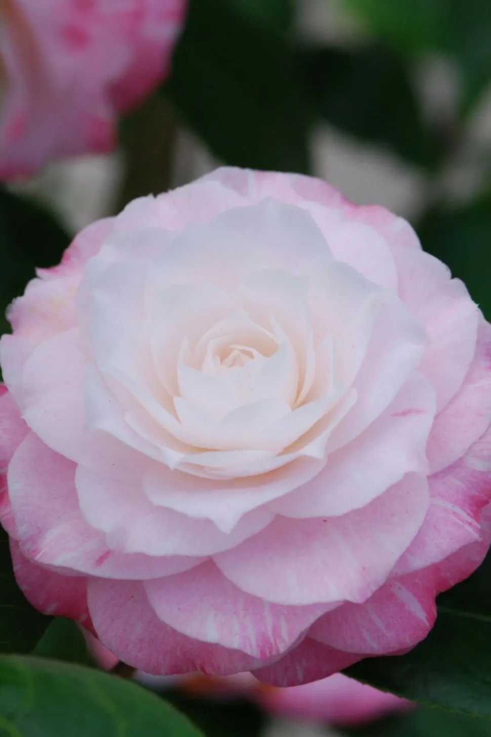 Créé aux États-Unis dans les années 1970, ce camélia est tout en raffinement. Son feuillage persistant, elliptique et coriace, d’un vert foncé très brillant se veut un merveilleux écrin pour une floraison hivernale toute en délicatesse. ‘ partir de décembre et jusqu’en mars, des fleurs de petite taille éclosent en continu pour illuminer l’hiver. Les adorables fleurs doubles aux pétales imbriqués de ce camélia affichent des couleurs très douces. Elles sont en effet largement et irrégulièrement marginées et panachées de rose pâle. Toutes les fleurs sont différentes les unes des autres par leurs teintes ravissantes.