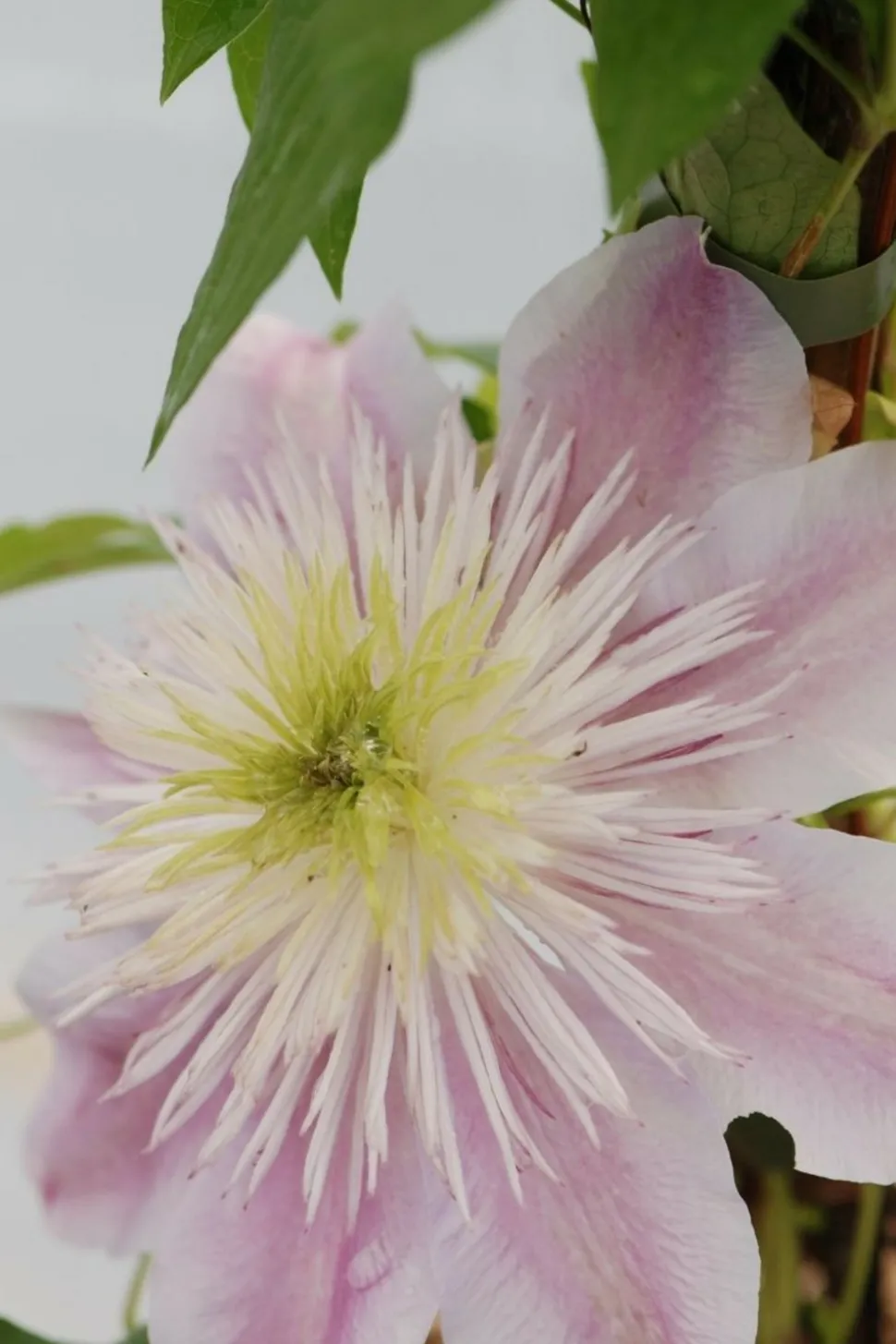 Mais cette clématite est également remarquable par sa floraison. Ses fleurs doubles, larges de 12 à 15 cm de diamètre, arborent un magnifique rose pâle très clair rehaussé de médianes d’un rose plus soutenu. Les tépales intérieurs forment un pompon hérissé et plumeux d’un rose mauve oscillant vers le rose pourpre. La floraison très remontante intervient en mai-juin puis en septembre pour une deuxième salve.