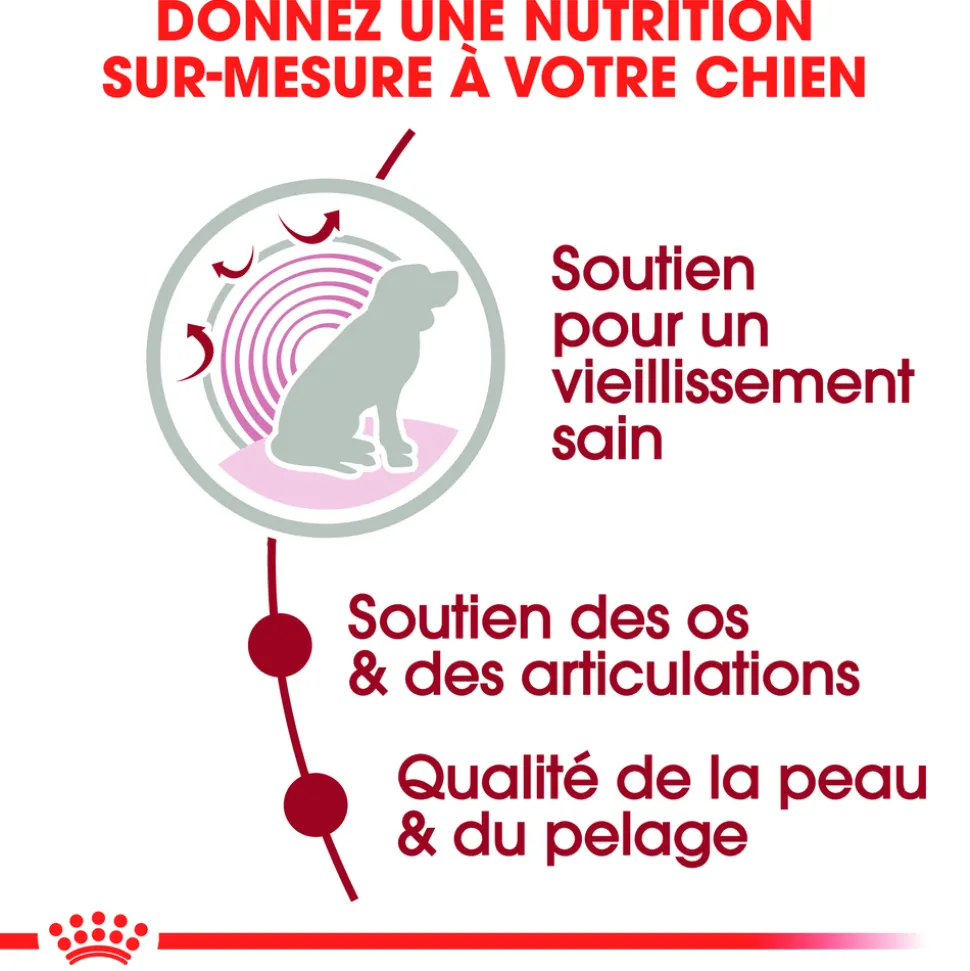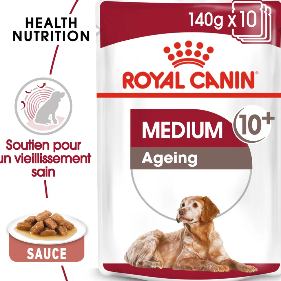 Pour tous les chiens de taille moyenne âgés de 10 ans et plus et pesant entre 11 et 25 kg, Royal Canin a conçu ces bouchées en sauce Medium Ageing 10+. Spécialement formulées pour répondre à tous les besoins nutritionnels des chiens matures de taille moyenne, et soutenir leurs os et leurs articulations, elles sont riches en protéines de haute qualité et digestes. Ces bouchées en sauce Medium Ageing 10+ Royal Canin sont présentées en boîte de 10 sachets fraîcheur de 140 g.