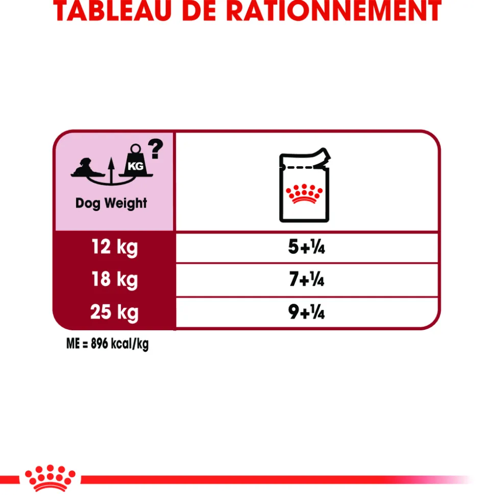 Référez-vous au tableau des rations conseillées en fonction de l’âge, de la taille et du niveau d’activité de votre animal.