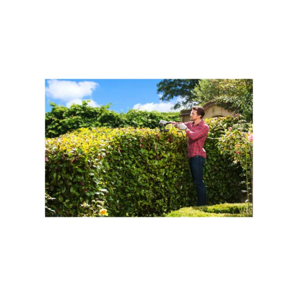 Présentation : Le taille-haies électrique RYOBI 550W RHT5655RS , avec sa fonction scie et double affûtage des dents offre une belle qualité de coupe et plus de rendement. Sa poignée arrière rotative avec cinq postions sur 180° permet de tailler plus facilement les haies sous différents angles. Avantages : Moteur puissant et léger de 550W – Idéal pour la taille des branches fines, des branches anciennes et des branches dures Lames double action affûtées au diamant pour une finition impeccable et moins de vibrations Fonction scie et double affûtage des dents pour une plus belle qualité de coupe et plus de rendement Poignée arrière rotative 5 positions sur 180° pour tailler facilement les haies sous différents angles Poignée avant ergonomique et confort (pression sans effort) pour une prise en main ferme et confortable quelque soit la position de travail Protège lame translucide pour une meilleure visibilité des lames pendant le travail Poignée ergonomique micro-alvéolée GripZone+™ avec large gâchette d’accélération pour une prise en main ferme et confortable et une meilleure maîtrise de la machine Compatible avec le collecteur de déchets HedgeSweep™ dissociable de la lame pour évacuer les coupes sans effort, en les poussant hors de la haie Butée de protection pour une coupe au ras des murs et du sol Performances : Puissance absorbée : 550 W Capacité de coupe max. : 26 mm Lame : 55 cm Type de lames : Affutage au diamant Vitesse de lame : 3000 cps/min Poids : 3.6 kg Ref. 5133003643 Conditionnement : Un taille-haies électrique RYOBI 550W RHT5655RS Livré dans son emballage d’origine Garantie : Garantie 2 ans + 1 an d’extension sous conditions d’enregistrement sur tous les outils Ryobi filaires et sans fil, batteries et chargeurs compris.