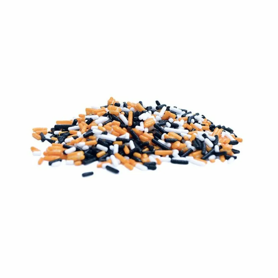 Décorez vos pâtisseries avec ce mix de vermicelles en sucre aux teintes d’Halloween : orange, noir et blanc. Saupoudrez vos cupcakes, biscuits, gâteaux afin de rajouter une touche colorée et croquante ! Valeurs nutritionnelles moyennes pour 100 g / Valeur énergétique : 1707 kJ 鈥ères grasses : 1,9 g – dont acides gras saturés : 1,8 g / glucides : 95 g – dont sucres : 92 g / protéines : 0,5 g / sel : 0,1 g. Poids net : 80 g.
