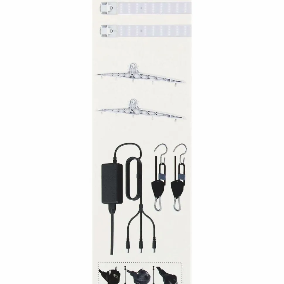Le Kit TNOLED 2x40W pour la phase de croissance de Secret Jardin est fourni en tant que kit complet, comprenant l’adaptateur secteur, le système de suspension ainsi que 2 barres de 40W.