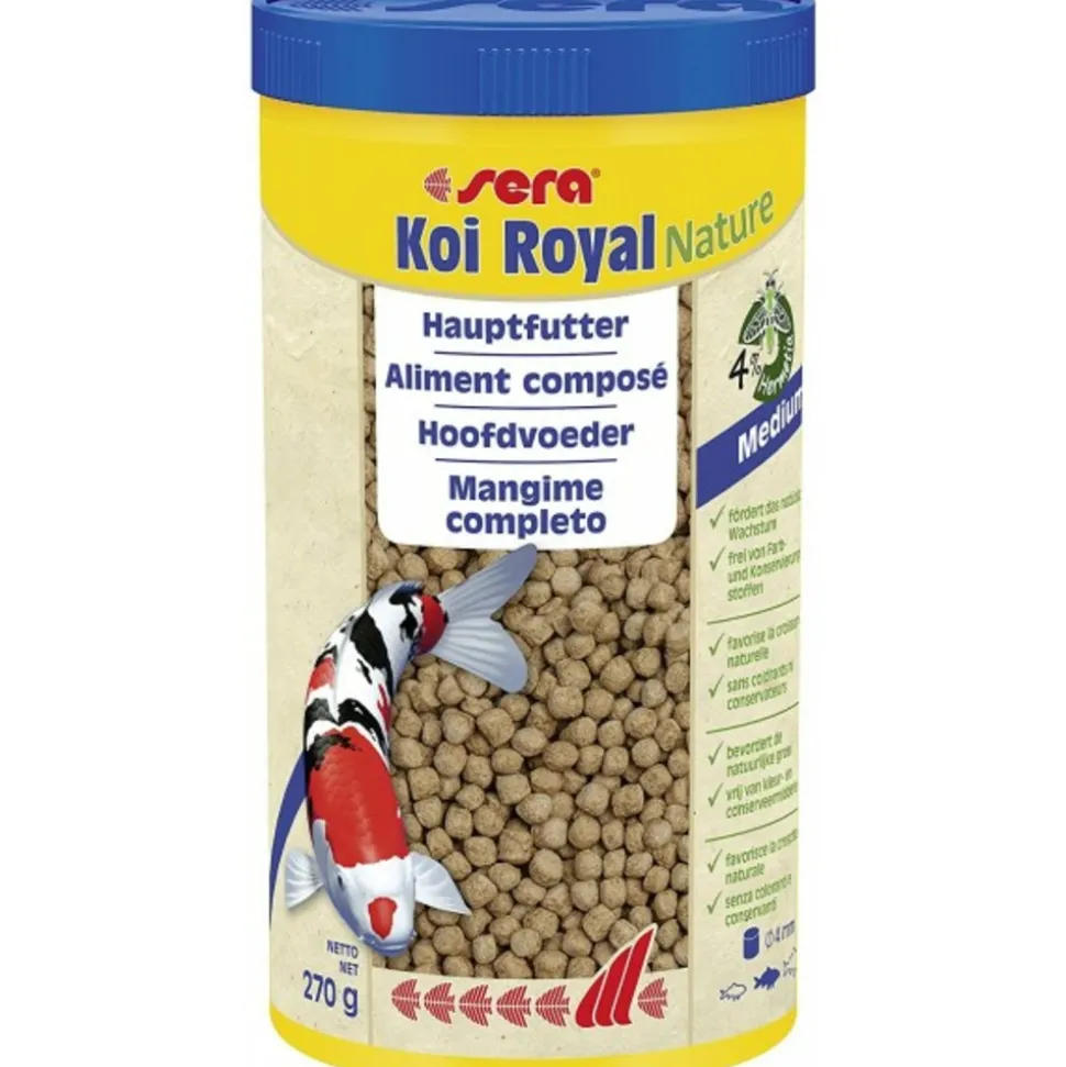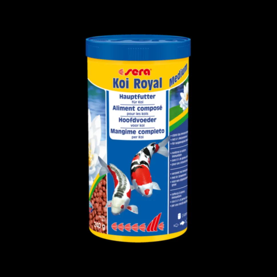Nourriture pour carpe koi sera pond koi royal pour bassin de jardinnourriture poissons de bassinaliment composé pour une croissance équilibrée des carpes koïs de 12 à 25 cmsera koi royal medium (4 mm) est l’aliment composé à base de granulés fabriqués selon un procédé spécial, pour tous les koïs de votre bassin de jardin. Grâce à son rapport glucides/protéines équilibré et à sa teneur de 4 % de germes de blé, cet aliment est particulièrement digeste, étant approprié pour une alimentation complète tout au long de l’année. Il répond parfaitement aux besoins des koïs. Les précieux ingrédients, tels que les acides gras oméga et les mannane-oligosaccharides stimulant le système immunitaire, favorisent le développement sain et les défenses naturelles. Les granulés flottants conservent longtemps leur forme et ne polluent pas l’eau.Aliment complet pour carpes koïsnourrir plusieurs fois par jour par petites quantités, en ne donnant aux animaux que la quantité qu’ils peuvent absorber en peu de temps. Pour renforcer d’éclat des couleurs, nous recommandons de nourrir les poissons en complément avec sera koi professional spirulina aliment composé spécial couleurs.Mode d’emploipendant toute l’année, nourrir 1 à 2 fois par jour par petites quantités, en ne donnant aux animaux que la quantité qu’ils peuvent absorber en peu de temps.ingrédientsfarine de poisson, amidon de maïs, farine de blé, hermetia (4 %), gluten de blé, huile de poisson (dont 49 % d’acides gras oméga), levure de bière, mannane-oligosaccharides, perna canaliculus, ail, algues haematococcus.Constituants analytiquesprotéines brutes 33,0 %, matières grasses brutes 6,9 %, fibres brutes 3,1 %, humidité 5,0 %, cendres brutes 5,7 %.Additifsvitamines et provitamines : vit. A 14.400 ui/kg, vit. D3 1.800 ui/kg, vit. E (d-l-acétate de tocophérol) 180 mg/kg, vit. B1 18 mg/kg, vit. B2 18 mg/kg, vit. C stab. (l-ascorbyle monophosphate) 180 mg/kg.