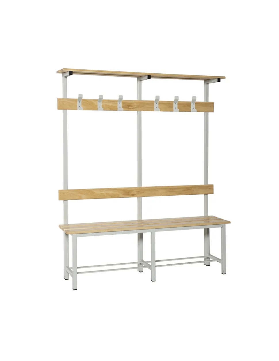 Banc de vestiaire en bois et métal. Livré monté. Il n’est pas nécessaire de l’ancrer au mur. C’est rigide. Ça ne bouge pas. Couleur du produit GRIS/GRIS. Dimensions 1500x1800x350.