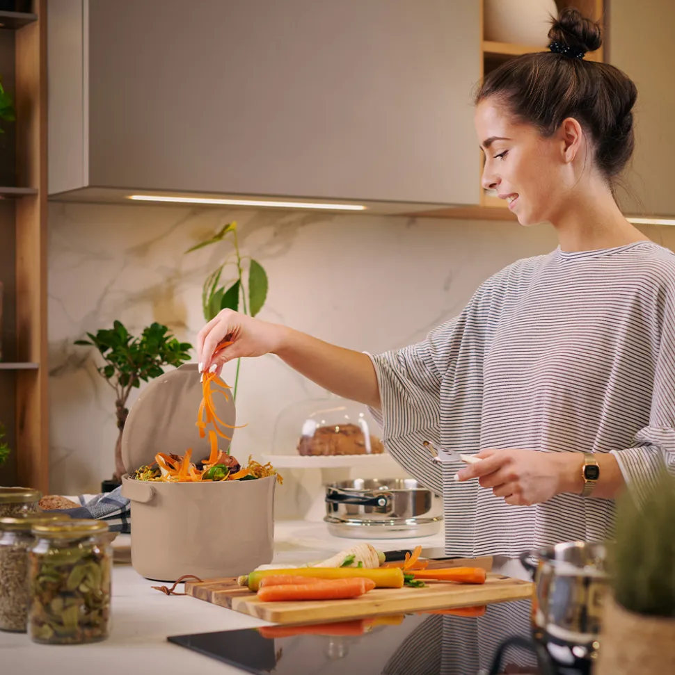 Organko Daily n’est pas une simple poubelle. Elle est fabriquee a partir de plastique post-consommation. En d’autres termes, il s’agit de plastique recycle, issu de produits mis au rebut, qui sont collectes dans des conteneurs dedies aux emballages ou au plastique. Organko Daily est donc le reflet de notre et de votre respect de la planete Terre pour un avenir meilleur et plus sain.Utilisez Organko Daily et prenez soin de deux choses : moins de plastiques jetes et un recyclage coherent des biodechets, qui constituent un probleme mondial croissant ces dernieres annees.Nous pensons qu’il est temps d’aller de l’avant et de faire de grands changements pour le mieux en commencant par de petits pas.Organko Daily sert egalement de poubelle a biodechets dans laquelle vous collectez les dechets alimentaires et les videz une fois par jour dans les composteurs Bokashi Organko. De cette maniere, la fermentation sera encore meilleure et vous obtiendrez bientot du liquide bokashi issu des composteurs Bokashi, avec lequel vous pourrez nettoyer les canalisations ou arroser vos plantes. Les dechets alimentaires fermentes constitueront une excellente base de compost, pleine de nutriments et de mineraux.