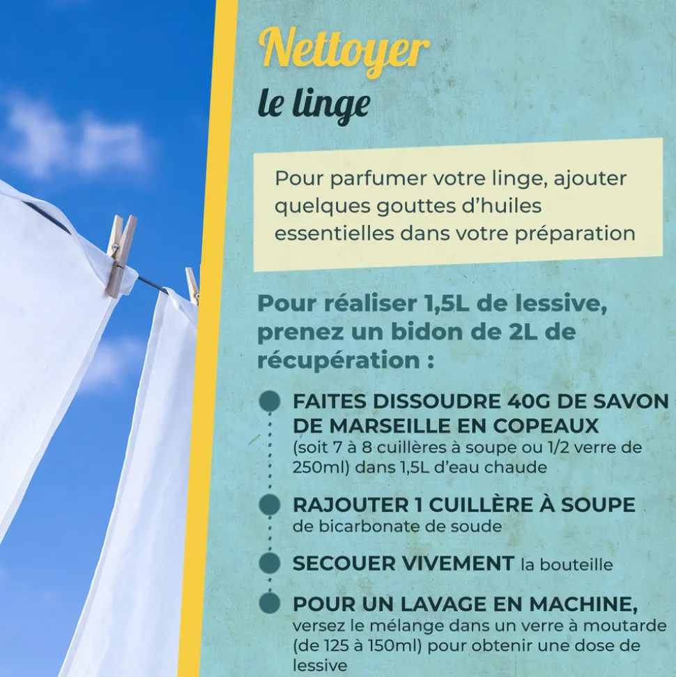 Pour éliminer les taches sur le linge : passez le textile taché sous l’eau froide puis savonner à l’aide de votre savon de Marseille. Frottez ensuite énergiquement pour faire mousser puis rincez.