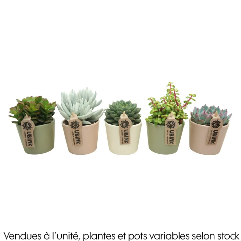 Les plantes qualifiées de succulentes peuvent en fait appartenir à de très nombreuses familles différentes. Les cactus, les agaves, les sedums, mais aussi l’Aloe vera, l’Euphorbe, le Kalanchoé et beaucoup d’autres sont regroupées sous ce même qualificatif. Elles ont toutes en points communs, un entretien facile, une bonne résistance à la sécheresse et aux maladies. Attention, les variétés peuvent changer selon les disponibilités et les arrivages.