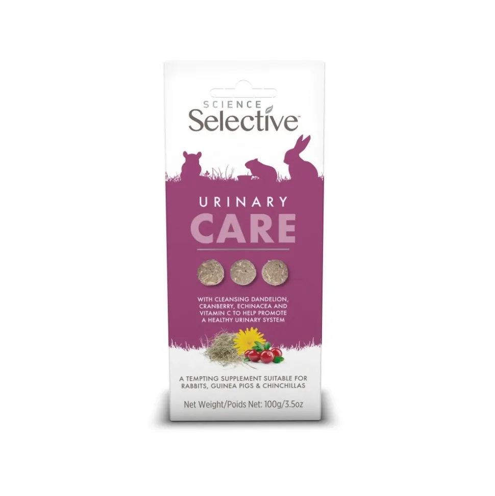 Science Selective Urinary Care est un complément naturel conçu pour soutenir la **santé urinaire** des lapins, cochons d’Inde et chinchillas. Intégrant des ingrédients purifiants comme pissenlit, cranberry, échinacée et vitamine C, il aide à prévenir les infections urinaires et les calculs tout en renforçant l’immunité.