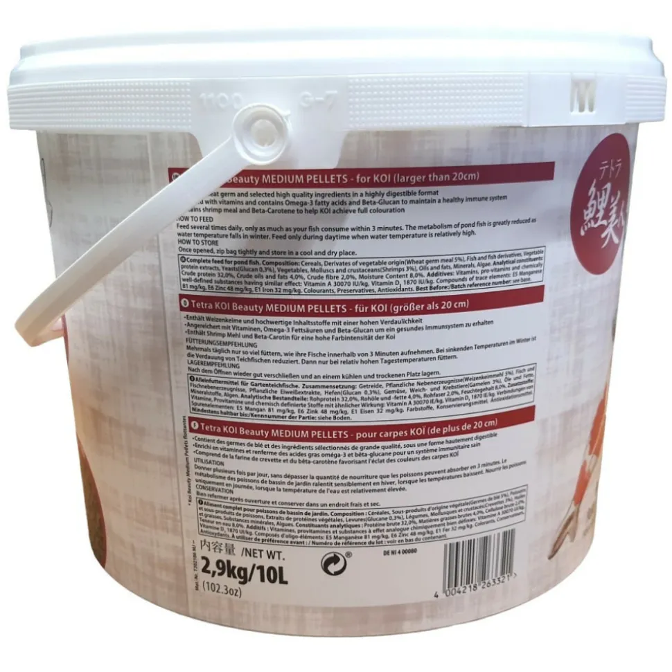 Nourriture tetra pond koi beautynourriture carpes koïaliment complet en sticks pour tous poissons de bassin pour une alimentation saine et biologiquement équilibrée. Des poissons plus résistants grâce à la vitamine c stabilisée et à tous les nutriments, oligo-éléments et vitamines.Utilisation : donner plusieurs fois par jour, sans dépasser la quantité de nourriture que les poissons peuvent absorber en 3 minutes.Le métabolisme des poissons de bassin de jardin ralentit sensiblement l’hiver, lorsque les températures baissent.Nourrir les poissons uniquement en journée, lorsque la température de l’eau est relativement élevée.Pour carpes koï de plus de 10 centimètres.Pellets de 5 mm