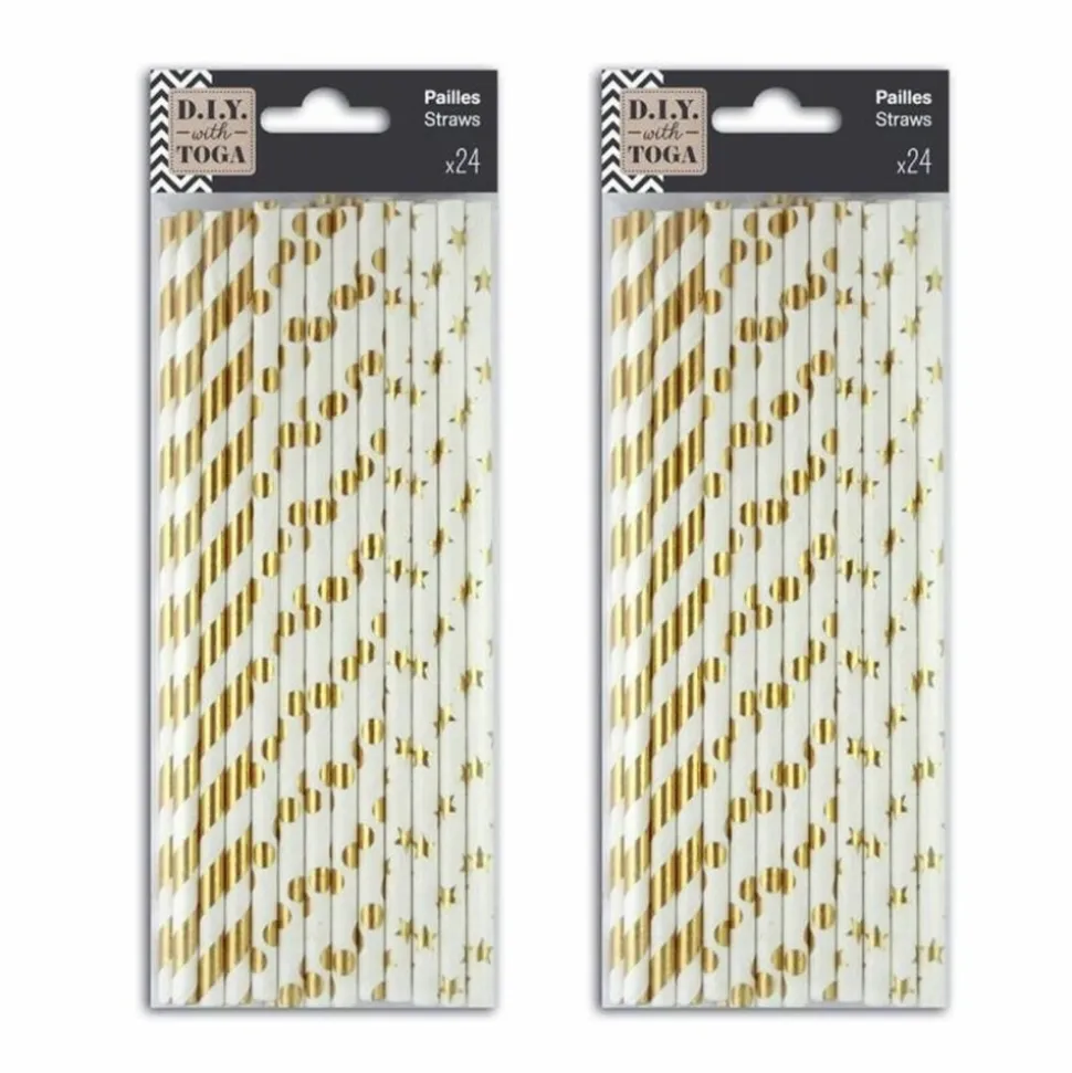 Vous voulez apporter une touche chic à votre événement? Ces 2 kits de 24 pailles blanches et dorées sera parfait pour siroter vos cockatils avec élégance! Les pailles de ce pack sont dorées avec des motifs différents : étoiles dorées, à pois dorés et à rayures dorées pour customiser vos fêtes d’anniversaires ou vos soirées à thème.