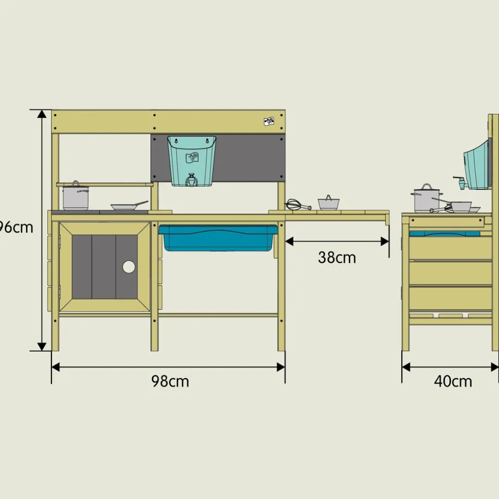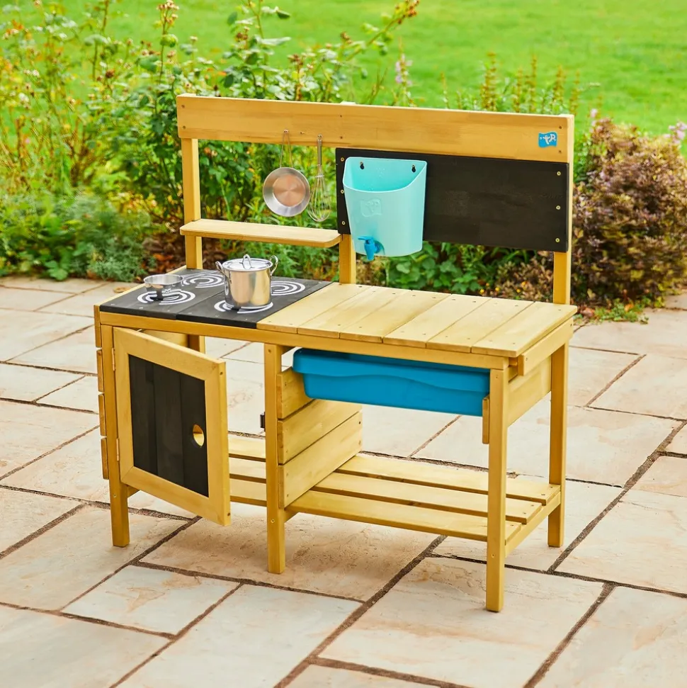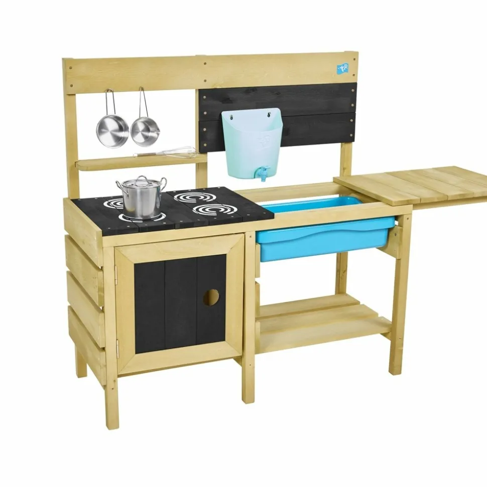 Découvrez la cuisine TP Deluxe fabriquée en bois et regorgeant de caractéristiques plus ludiques les unes que les autres : une bassine spacieuse et robuste, un réservoir à eau rechargeable et un véritable robinet pour mélanger la boue encore plus facilement…