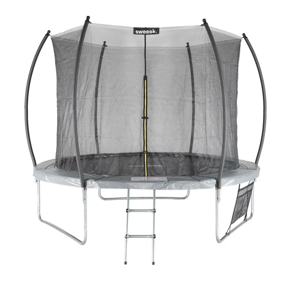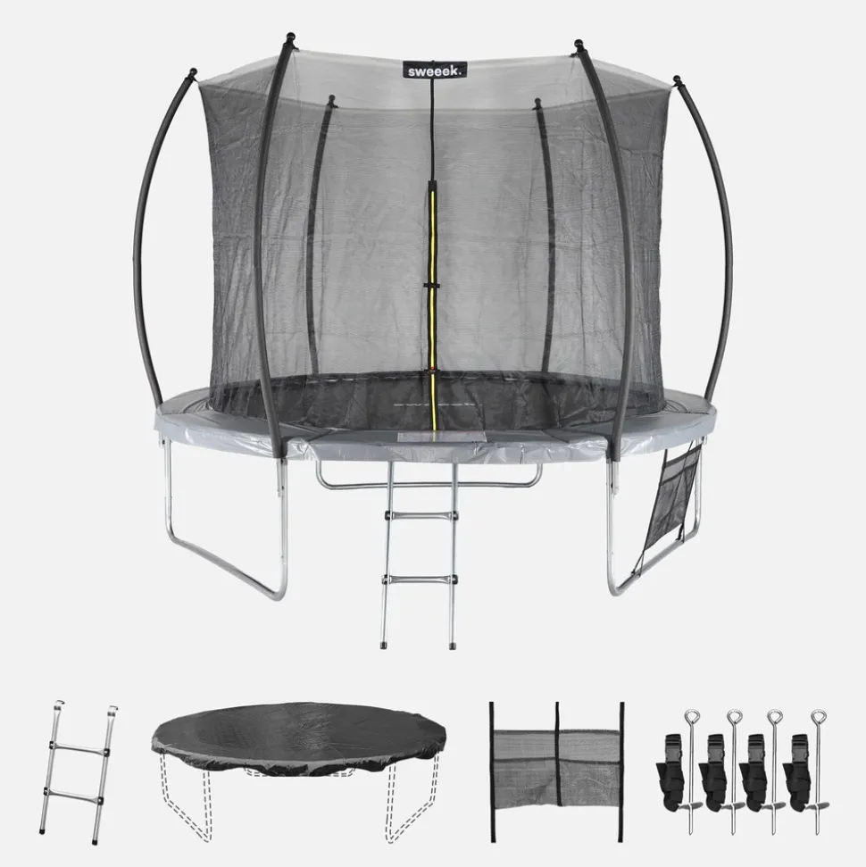 Trampoline :Dimensions Ø305 cm x 256 cmHauteur sol/cadre 76 cmDiamètre extérieur trampoline Ø3,03mAccessoires inclus : Echelle: En acier peinture epoxy grise, montage à faire. 88×32 cmBâche: Ø320cm, polyéthylène noir avec trous de drainageFilet de rangement: 70x50cm, en polyéthylène (Maille 6x6m), 2 compartiments, facile à fixerDétails techniques Tapis de saut Ø261cmCoussin de protection: L28cm, Epaisseur 14mm en mousse polyéthylène expanséFilet de sécurité: Polyéthèlene, structure galvanisé à chaud, tubes Ø25mm (épaisseur : 1,2mm) avec fermeture éclair jaune pour vite répérer la sortie en cas d’urgence. Hauteur à partir du tapis de saut: 1,80m. Maille 6x6mmRessorts: 60 (coniques, galvanisé à chaud) 28 anneaux. L14,5cmTubes: Ø35mm (épaisseur : 1,1mm)Kit d’ancrage: Oui 3 de 26 cm (Ø7mm) à visser dans le sol, avec lanières clipsables.Attention. Pas de sauts périlleux.Attention. Toujours fermer l’ouverture du filet avant de sauter.Attention. Lire les instructions.Attention. Espace requis de 2 mètres minimum autour et au dessus du trampoline.Attention. Ne convient pas aux enfants de moins de 36 mois; risques de chutes et asphyxie (les petits éléments sont susceptibles d’être avalés).Attention. Ce trampoline est destiné aux enfants de 3 à 12 ans.Attention. Max 100kgs.Attention. Destiné à une utilisation extérieure uniquement.Attention. Son utilisation doit se faire sous la surveillance d’un adulte.Attention. Réservé à un usage familial. Il ne peut en aucun cas être utilisé pour les collectivités : écoles, campings, hôtels, lieux publics etc…Attention. Un seul utilisateur à la fois. Risque de collision.Attention. Il est recommandé de remplacer le filet tous les 5 ans ou dès lors que celui-ci est endommagé.Attention. Il est impératif de lester ou de fixer votre trampoline au sol de façon permanente afin d’éviter au maximum un risque d’instabilité et de prise au vent.