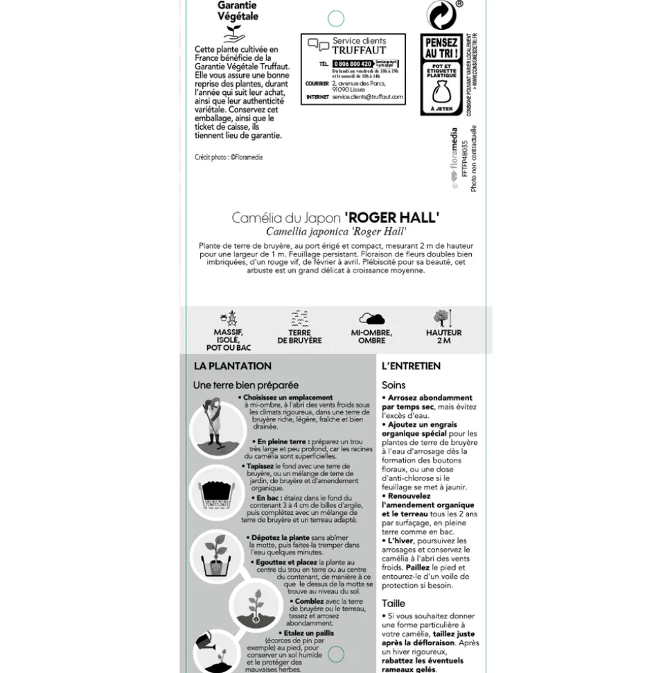 Le genre Camellia (Camélia) comporte environ 80 espèces, originaires d’Asie tropicale et sub-tropicale. Japonica est l’une de ces espèces, originaire du Japon, de Corée et de Chine. ‘ Roger Hall ‘ est une variété horticole obtenue en Australie en 1976. Cette plante de terre de bruyère, au port érigé, dense, atteint 2 m de hauteur pour une largeur de 1 m. Feuillage persistant, vert sombre. Fleurs doubles comportant des pétales bien imbriqués, rouge vif, de février à avril. Pousse dans un sol léger, humifère, légèrement acide. Exposition à mi-ombre ou à l’ombre. Rustique jusqu’à -15°C. Taille légère après la floraison si nécessaire, avec suppression des fleurs fanées au fur et à mesure. On la plante en isolée ou associée à d’autres plantes de terre de bruyère.