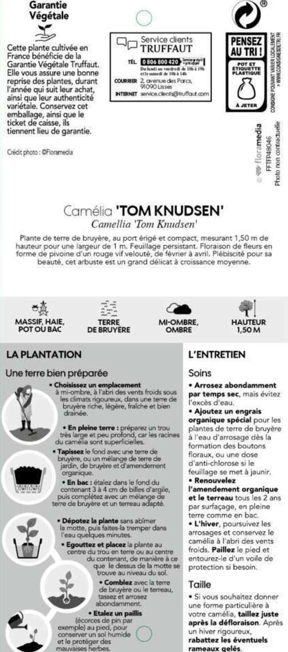 Le genre Camellia (Camélia) comporte environ 80 espèces, originaires d’Asie tropicale et sub-tropicale. Japonica est l’une de ces espèces, originaire du Japon, de Corée et de Chine. ‘ Tom Knudsen ‘ est l’une des nombreuses variétés horticoles. Cette plante de terre de bruyère, au port érigé et compact, atteint 1,50 m de hauteur pour une largeur de 1 m. Feuillage persistant, vert foncé vernissé. Floraison double, rouge vif velouté, de février à avril. Fleur en forme de pivoine Pousse dans un sol léger, humifère, légèrement acide. Exposition à mi-ombre ou à l’ombre. Rustique jusqu’à -15°C. Taille légère après la floraison si nécessaire, avec suppression des fleurs fanées au fur et à mesure. On la plante en isolée ou associée à d’autres plantes de terre de bruyère.
