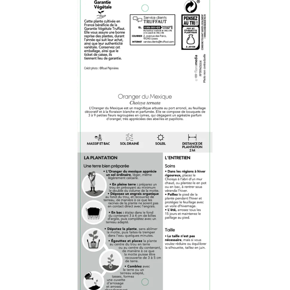 Le genre Choisya, dédié au pasteur et botaniste genevois Jacques-Denis Choisy (1799-1859), comprend 7 espèces originaires du sud ouest des Etats Unis et du Mexique. Choisya ternata ou oranger du Mexique est l’espèce la plus cultivée. Cet arbuste, au port arrondi, compact, atteint 2,50 m de hauteur pour une largeur de 2 m. Feuillage persistant, rameaux vert. Feuilles de 4 à 7 cm, à folioles ovales, odorantes. Floraison blanche, parfumée, en avril-mai, remontante en août. Fleur de 3 cm de diamètre, ressemblant à la fleur d’oranger, en cymes de 3 à 6, dépassant le feuillage. Rustique, mais ne supportant pas un froid au delà de -10 °C. A planter en situation chaude, ensoleillée, et à protéger du gel pendant l’hiver les premières années de plantation. Pousse dans un sol normal, léger, même légèrement calcaire. Exposition au soleil ou à mi-ombre. Supporte bien la taille pour la formation. On le plante en isolé, en association dans des massifs ou haies.