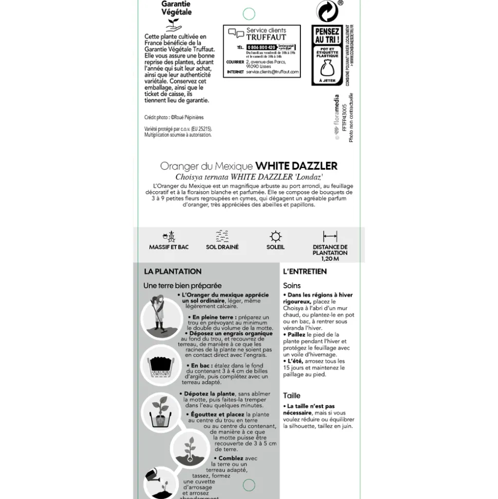 Le genre Choisya, dédié au pasteur et botaniste genevois Jacques-Denis Choisy (1799-1859), comprend 7 espèces originaires du sud ouest des Etats Unis et du Mexique. Choisya ternata ou oranger du Mexique est l’espèce la plus cultivée. ‘ White Dazzler ‘ est une variété horticole d’obtention récente.Cet arbuste élégant, au port arrondi, étalé, compact, atteint 1,20 m de hauteur pour une largeur de 1,20 m. Feuillage persistant, vert. Feuilles plus grande que l’espèce type, de 8 cm, à folioles ovales, très odorantes. Abondante floraison blanche, parfumée, en mai-juin, recouvrant entièrement le feuillage et remontante en août. Fleur de 3 cm de diamètre, en cymes de 3 à 6, ressemblant à la fleur d’oranger. Rustique, mais ne supportant pas un froid au delà de -12°C. A réserver à des régions au climat doux ou à planter en situation chaude, ensoleillée, et à protéger du gel pendant l’hiver.Pousse dans un sol normal, léger, même légèrement calcaire. Exposition au soleil ou à mi-ombre. La taille n’est pas nécessaire.On le plante en isolé, en association dans des massifs, en rocailles. Excellent en bac sur une terrasse.