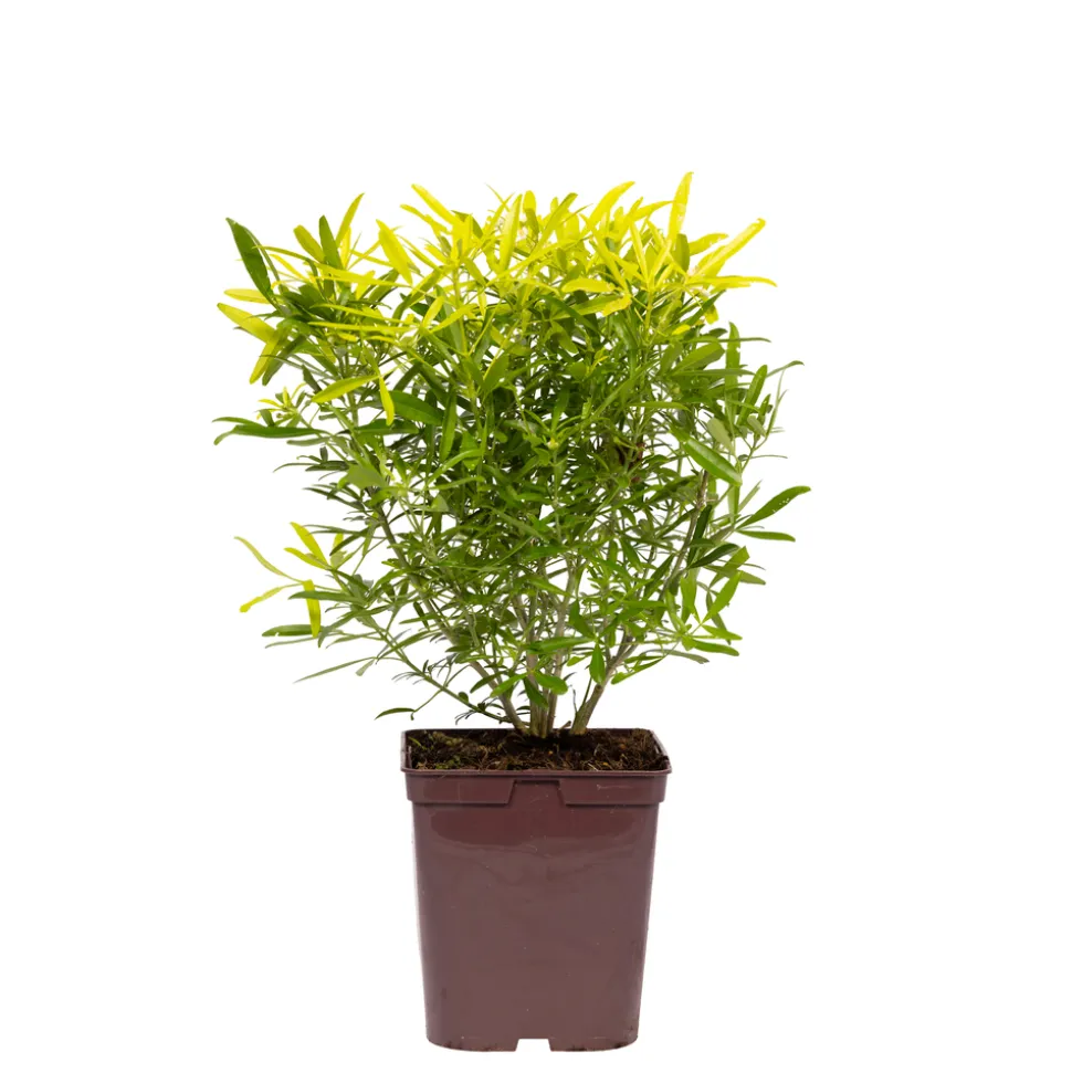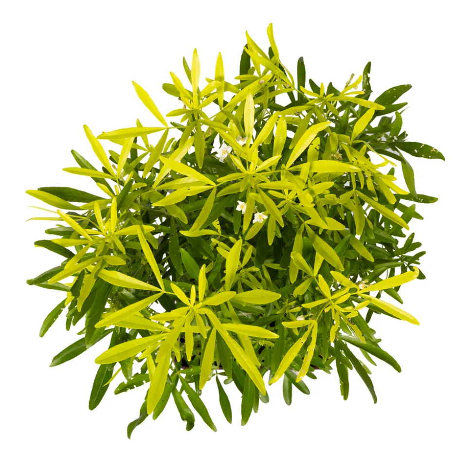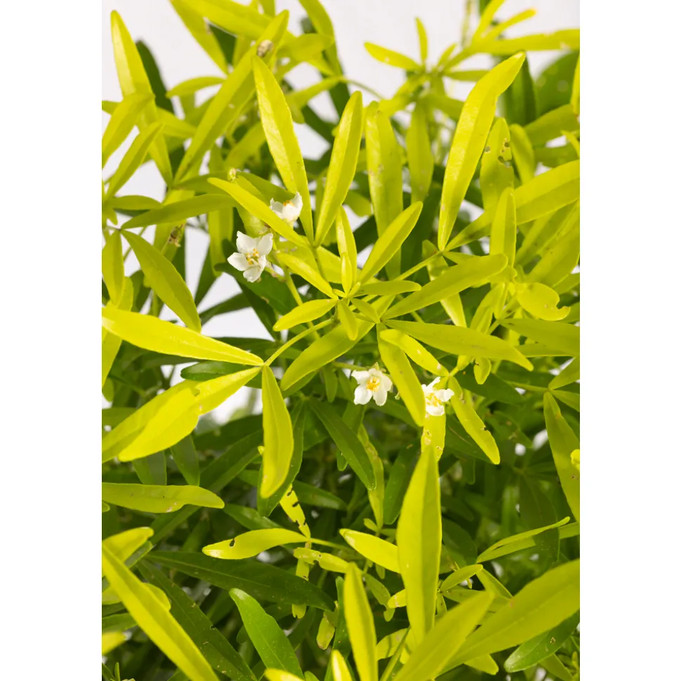 Plantez en bac cet arbuste à petit développement, au feuillage persistant, jaune doré au printemps, à la floraison blanche, parfumée, en mai-juin, très décoratif.