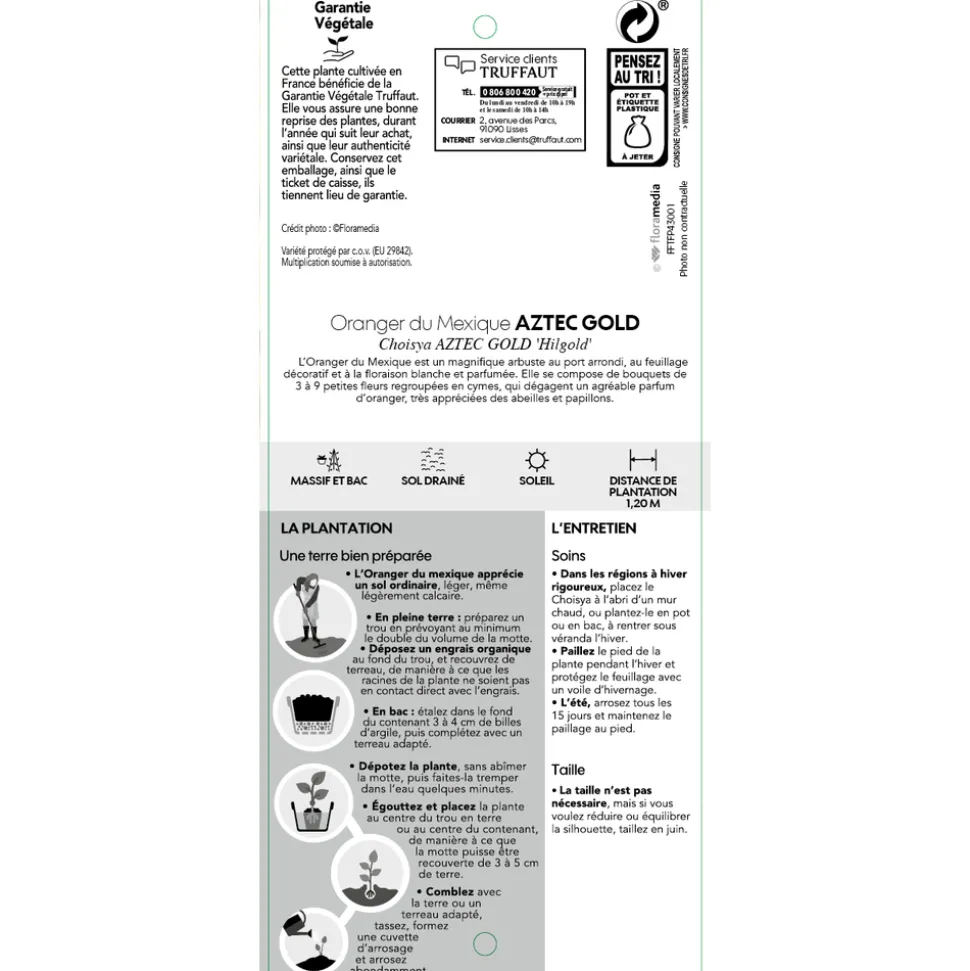 Le genre Choisya, dédié au pasteur et botaniste genevois Jacques-Denis Choisy (1799-1859), comprend 7 espèces originaires du sud ouest des Etats Unis et du Mexique. Choisya ‘ Aztec Gold ‘ est un hybride issu du croisement de Choisya ternata ‘Sundance’ avec Choisya x ‘Aztec Pearl’, obtenu en 2012 par Alan Postil aux pépinières Hillier en Angleterre. Ce petit arbuste, au port arrondi, compact, atteint 1,20 m de hauteur pour une largeur de 1,20 m. Feuillage persistant, jaune doré au printemps avec la base du feuillage jaune verdâtre. Feuilles divisées en segments étroits. Floraison blanche, odorante, en mai-juin, remontante en septembre. Rustique, mais ne supportant pas un froid au delà de -12 °C. À planter en situation chaude, ensoleillée, et à protéger du gel pendant l’hiver pendant les premières années. Pousse dans un sol légèrement acide, léger et riche en humus. Exposition au soleil ou à mi-ombre. Supporte bien la taille pour la formation. On le plante en isolé, en rocaille, en association avec des arbustes de petite taille. Convient très bien en bac.