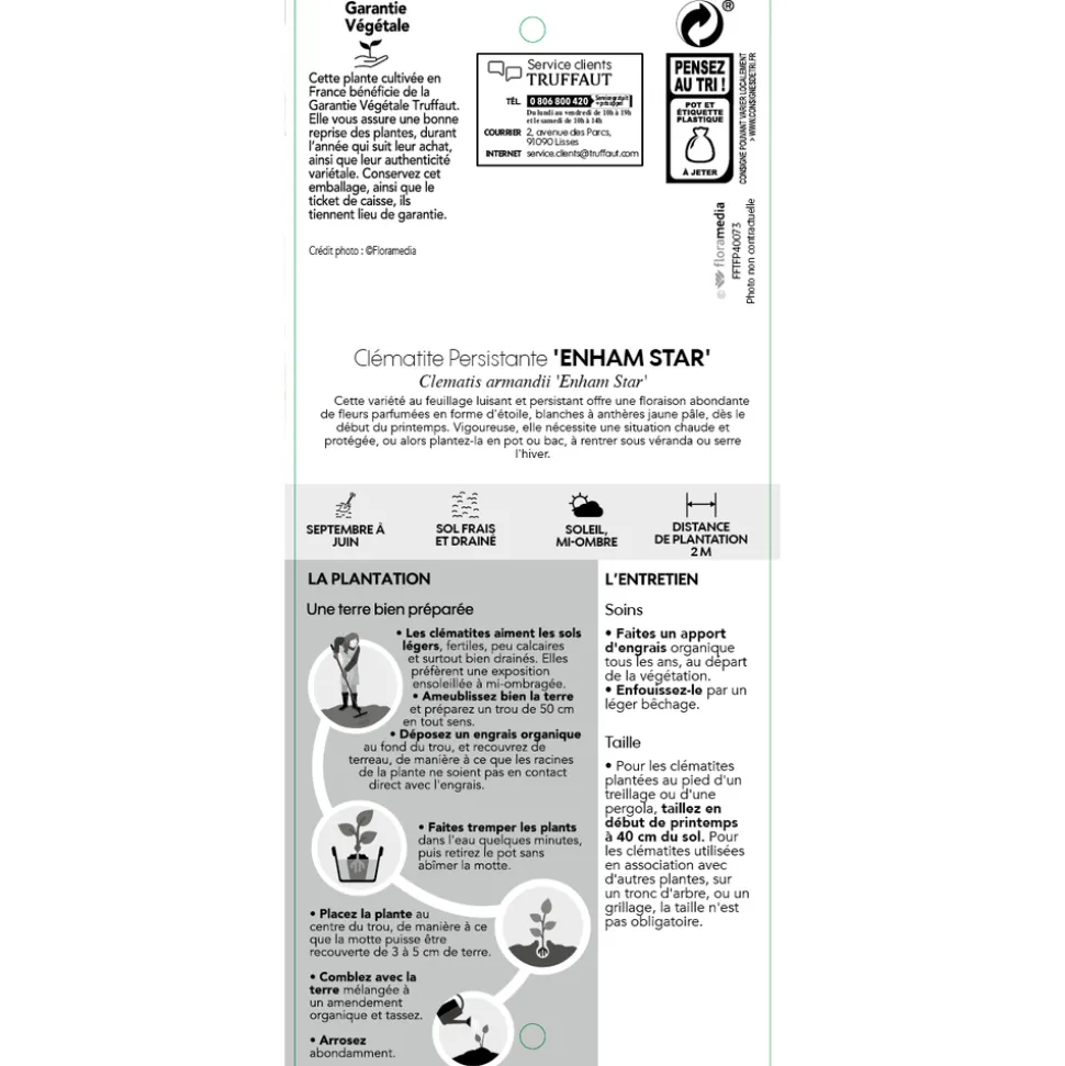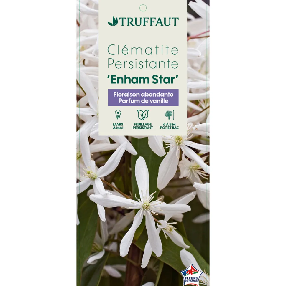 Le genre Clematis comprend environ 300 espèces, originaires de l’hémisphère Nord et d’Australie. Clematis armandii est l’une de ces espèces, originaire de la Chine Centrale. ‘Enham Star’ est une variété horticole.La clématite ‘Enham Star’ est une clématite à fleurs simples, de 5 à 7 cm de diamètre, blanc crème, parfumées. Elle fleurit en mars-avril. Feuillage persistant vert bronze au départ devenant vert foncé. Feuilles épaisses à 3 folioles. Rustique jusqu’à -12°C.