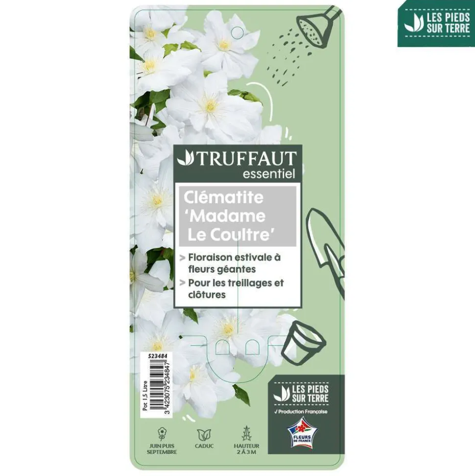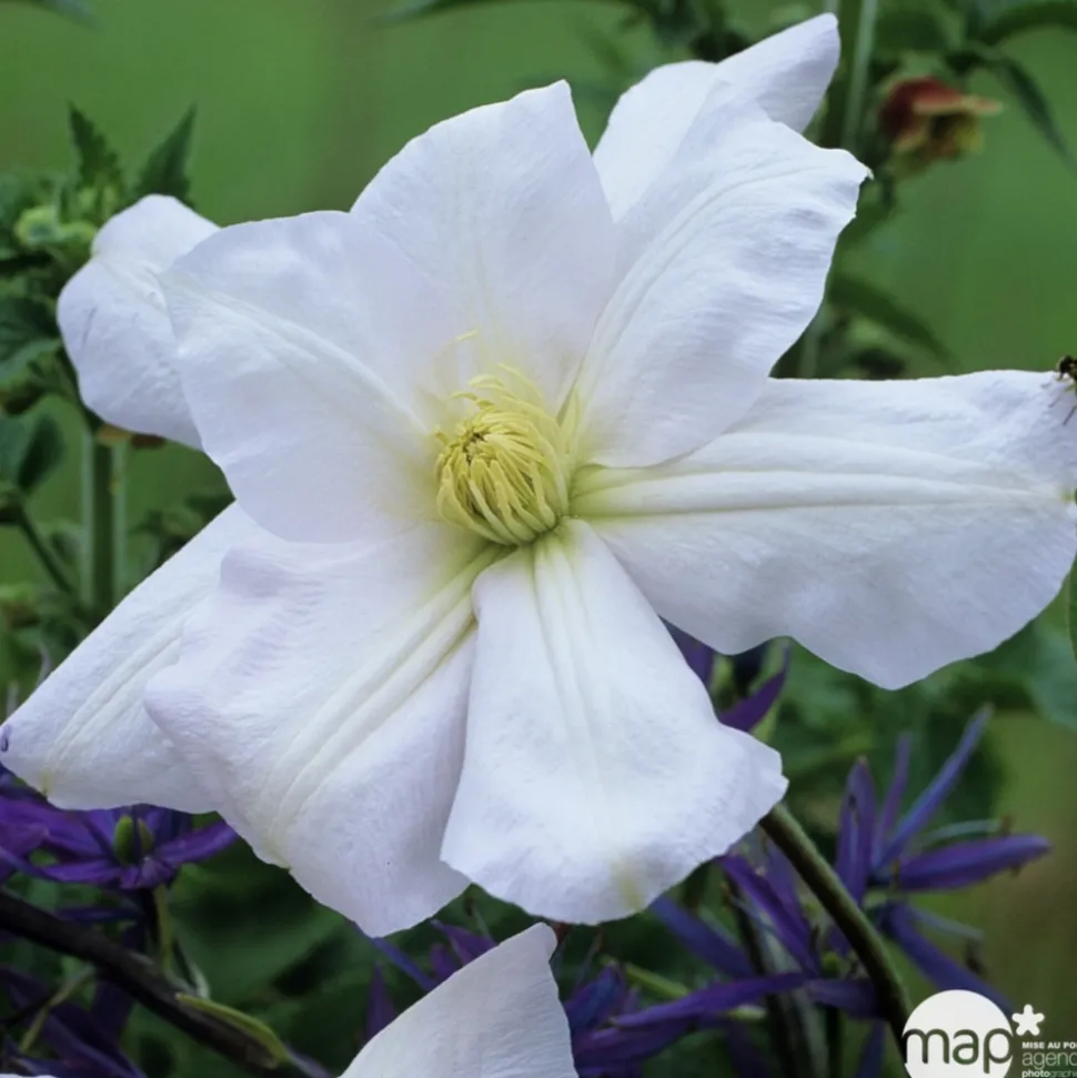Nommée aussi parfois ‘Marie Boisselot’, cette clématite à grandes fleurs a été créée en 1885 par le français Auguste Boisselot et a reçu le Prix de la Royal Horticultural Society of Garden Merit. Elle doit sa popularité à ses grandes fleurs blanches mesurant plus de 20 cm de diamètre. Les pétales sont larges et arrondis. Ils se chevauchent formant une corolle bien ouverte. Le coloris blanc pur à l’épanouissement est encore illuminé par le bouquet d’étamines crème. Cette grimpante caduque fleurit abondamment à la fin de printemps puis de nouveau en fin d’été. Ses dimensions permettent la culture en bac.