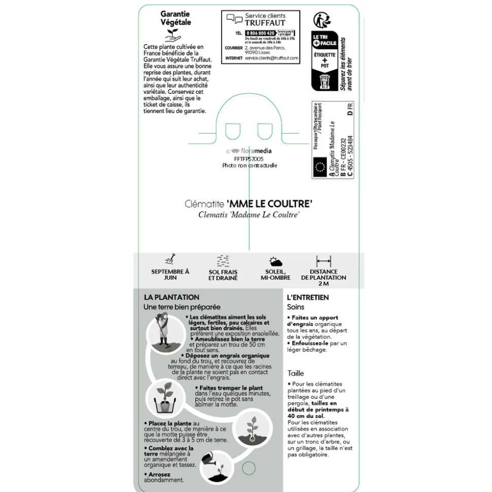 Placez-la à exposition légèrement tamisée pour mettre en valeur sa teinte blanc pur. Offrez-lui un sol fertile, léger, frais mais très bien drainé. Les clématites apprécient un léger ombrage au niveau des racines. Installez un petit arbuste à feuillage persistant devant leur souche.