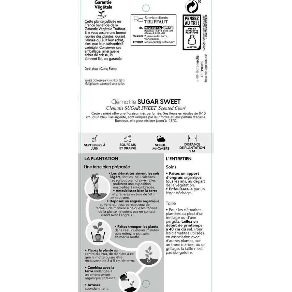 Les clématites à grandes fleurs représentent la grande majorité des espèces de clématite. On y retrouve principalement des hybrides, c’est-à-dire des croisements de deux variétés. La clématite ‘Sugar Sweet’ est une clématite à fleurs simples, de 8 à 10 cm, bleues à médianes argentées. Elle possède un parfum puissant de fleur d’acacia. Elle fleurit d’avril à mai.