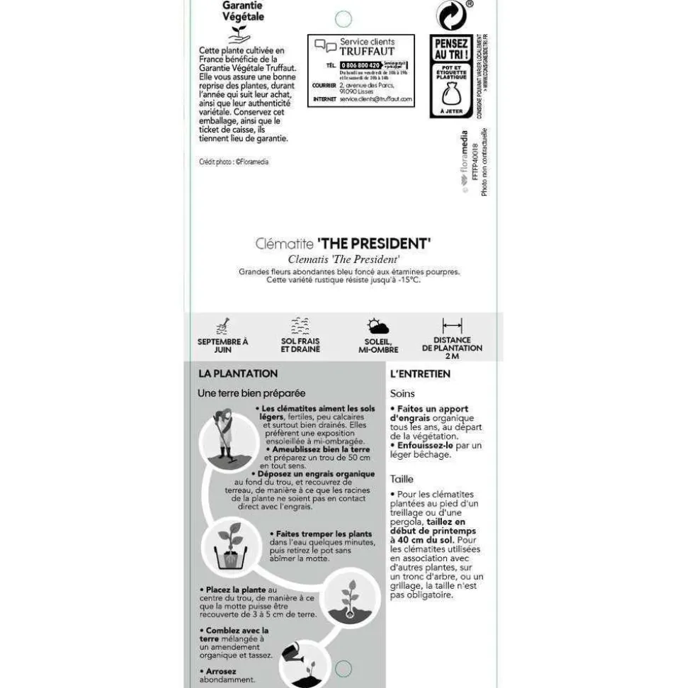 Le genre Clematis comporte environ 300 espèces originaires de l’hémisphère nord et d’Australie. Ce n’est qu’à la fin du XIXe siècle que la clématite est considérée comme une plante de grande valeur ornementale. La plupart des espèces cultivées proviennent d’Asie orientale. De très nombreuses variétés horticoles sont ainsi créées chaque année. ‘ The President ‘ est l’une de ces variétés. Cette plante grimpante atteint 3 m de hauteur pour une largeur de 2 m. Feuillage caduc, vert. Floraison en mai-juin puis en septembre. Fleurs bleu foncé, brillant, de 15 à 18 cm de diamètre. Pousse dans un sol normal, léger, fertile. Exposition au soleil ou à mi-ombre (pied à l’ombre). Tailler en juillet 1/3 de la longueur des rameaux ayant fleuri pour favoriser la remontée de septembre. Nouvelle taille légère à l’automne. On la plante contre un mur sur un support, contre un treillage, dans un arbre ou dans une haie pour apporter de la couleur.