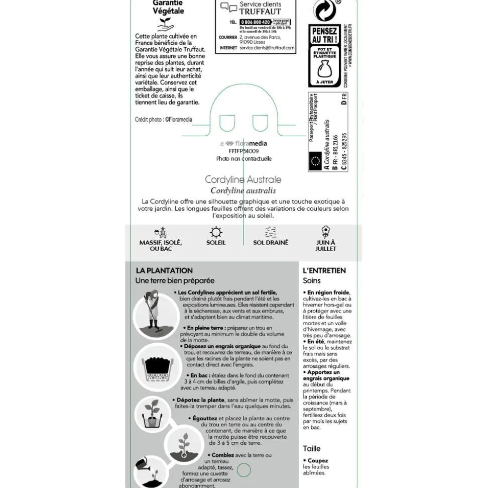 Cet arbre, au port érigé, semblable à un palmier, originaire de Nouvelle-Zélande, atteint une hauteur de 10 m (2 m en pot), pour une largeur de 5 m. Feuillage persistant, vert à vert clair. Feuilles recourbées, lancéolées à linéaires, souvent retombantes, de 40 à 80 cm de long. Elles poussent et se développent de façon circulaire à l’intérieur des branches charpentières. Floraison estivale, en panicules de petites fleurs blanc crème parfumées, de 80 cm. Fruits en automne, baies blanc bleuâtre. Rustique jusqu’à -10°C. En région froide, à hiverner dans une serre froide entre 5 et 7°C. A planter dans un sol normal, pultôt frais, bien drainé. Exposition au soleil. Culture en pot: bien arroser pendant l’été, pour maintenir le sol frais. De mai à septembre apport d’engrais liquide tous les 15 jours.