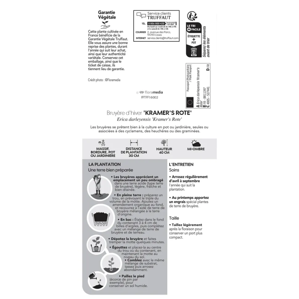 Le genre Erica (bruyère) comporte environ 600 espèces, originaires d’Afrique du Sud et des régions méditerranéennes. Erica x darleyensis est un hybride, résultat du croisement de Erica carnea et Erica erigena. ‘ Kramer’s Rote ‘ est une variété horticole. Cette bruyère d’hiver, vigoureuse, atteint 40 cm de hauteur pour une largeur de 70 cm. Feuillage persistant, vert clair. Floraison rouge foncé de novembre à avril. Pousse dans un sol normal, même légèrement calcaire, bien drainé. Exposition au soleil ou à mi-ombre. Rustique jusqu’à -18°C. Taille après la floraison. On l’utilise en massifs et comme couvre-sol.