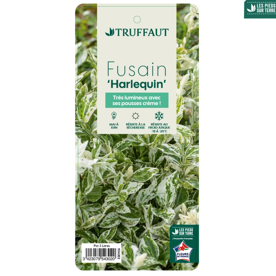 Le genre Euonymus (Fusain) comprend environ 170 espèces, originaires d’Amérique du Nord, d’Europe, d’Asie, d’Afrique et d’Australie. Euonymus fortunei est une espèce originaire de Chine, introduite en Europe en 1907. ‘Harlequin’ est une variété horticole.Cet arbuste, au port étalé, à la végétation naine, très tapissante, atteint 25 cm de hauteur pour une largeur de 50 cm. Feuillage persistant, vert bleuté, brillant, moucheté de blanc sur toute la surface. Feuilles ovales de 2 à 4 cm de diamètre.Pousse dans un sol normal, sec, même calcaire. Exposition à mi-ombre, de préférence, pour la beauté du feuillage. Rustique, jusqu’à – 20°C. Ne nécessite aucune taille, sauf pour l’égaliser.On le plante en isolé dans une rocaille, en groupe sur talus. Excellent en bac.