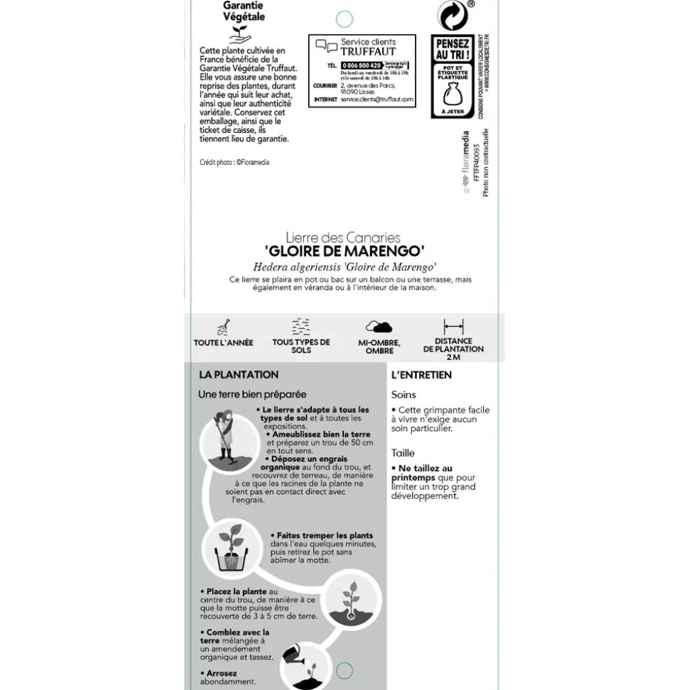 Offrez-lui un sol ordinaire ni trop humide, ni trop sec. Quand il est bien installé, le lierre supporte des périodes de sécheresse. Evitez-lui les expositions trop ensoleillées et brûlantes mais 2 ou 3 heures de soleil sont nécessaires pour de belles panachures. Si le froid anéantit le feuillage en hiver, ne touchez rien. La plante n’est pas forcément morte et peut développer un nouveau feuillage dès le printemps. Cultivé en pot, ce lierre conserve des dimensions plus modestes qu’en pleine terre et culmine autour des 2 m.