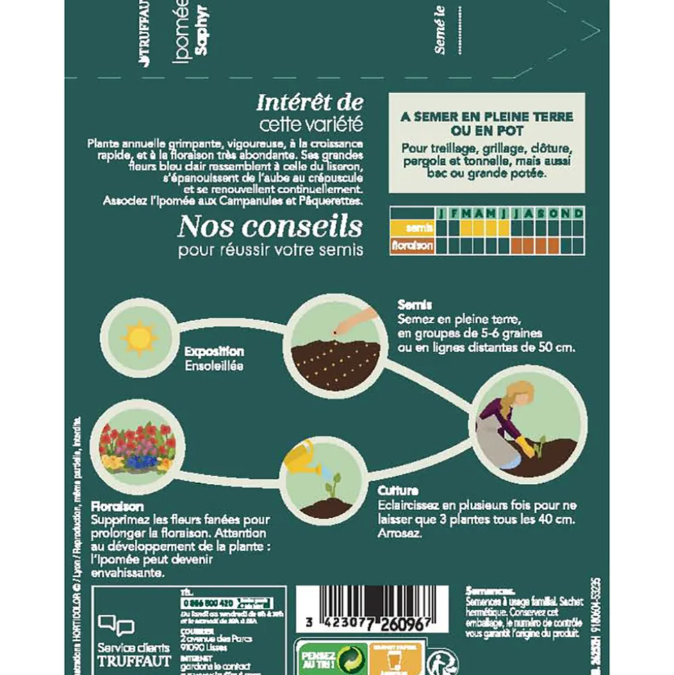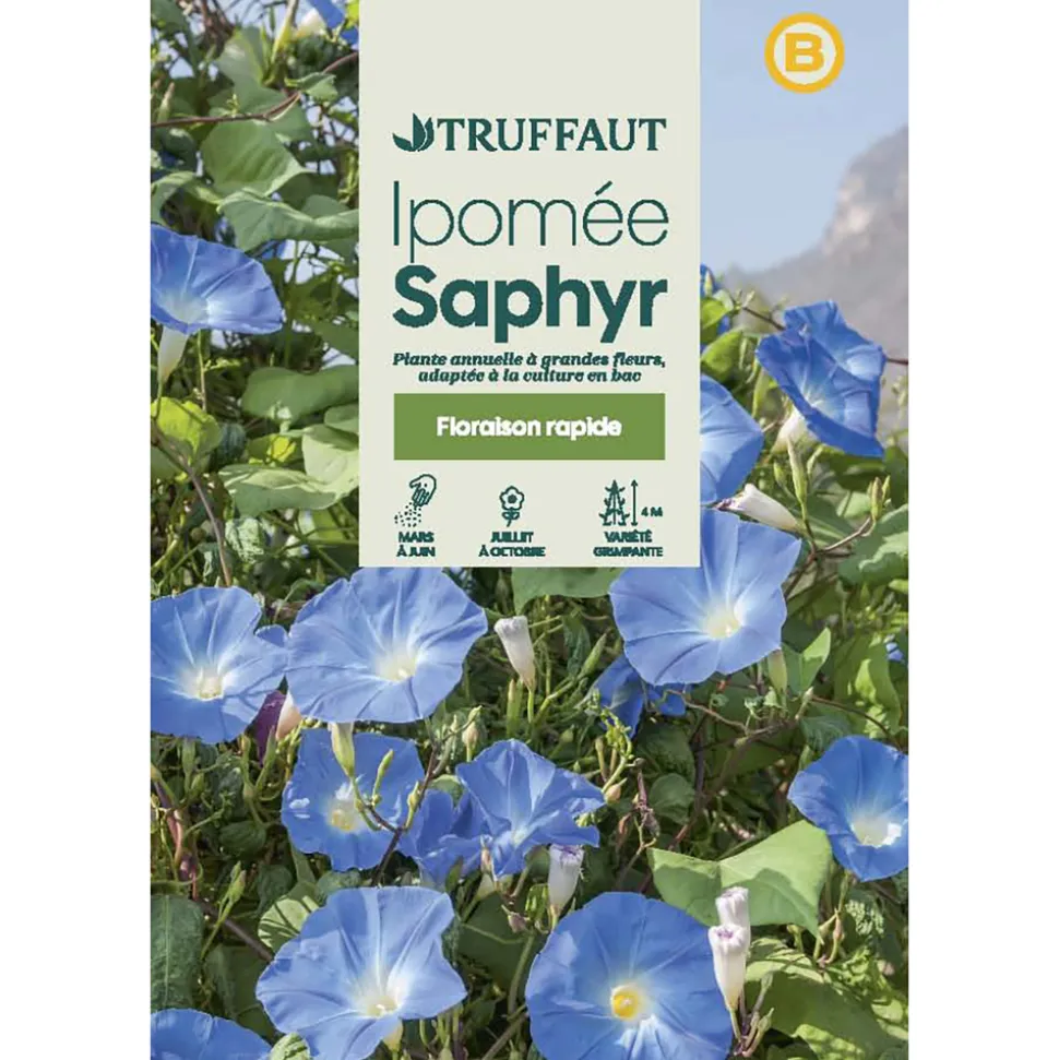 Ces graines d’ipomée Saphir à grandes fleurs bleu ciel illumineront votre jardin. Cette plante grimpante à floraison précoce et abondante sera parfaite le long des clôtures et des treillages. Cette variété se cultive facilement et dispense une végétation dense et luxuriante. Ses fleurs rappellent la beauté et l’élégance des liserons. Utilisée comme ornementation des murets, l’ipomée Saphir à grandes fleurs sera parfaitement mise en valeur si vous la combinez à d’autres espèces grimpantes.