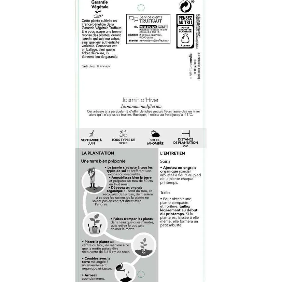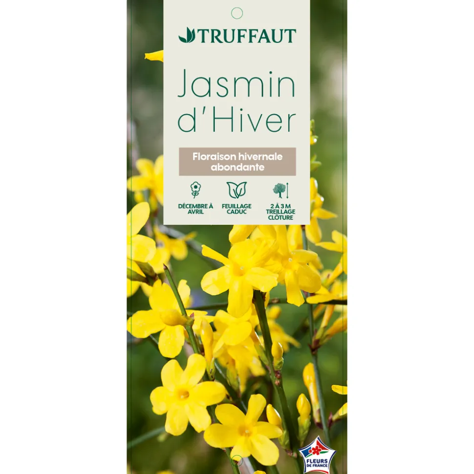 Introduit en Europe au milieu du 19ieme siècle, le jasmin d’hiver est un arbuste caduc aux minces tiges souples qu’il est possible de palisser afin de l’utiliser comme grimpant. Parfaitement rustique, il fleurit en hiver, produisant à la faveur du moindre redoux une multitude de fleurettes solitaires et tubulaires, jaune brillant. Elles compensent leur absence de parfum par un effet très lumineux, bienvenu à la mauvaise saison. Les petites feuilles vert sombre, composées de 3 folioles, apparaîssent en fin d’hiver.