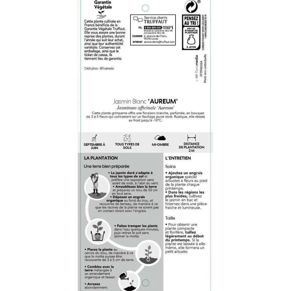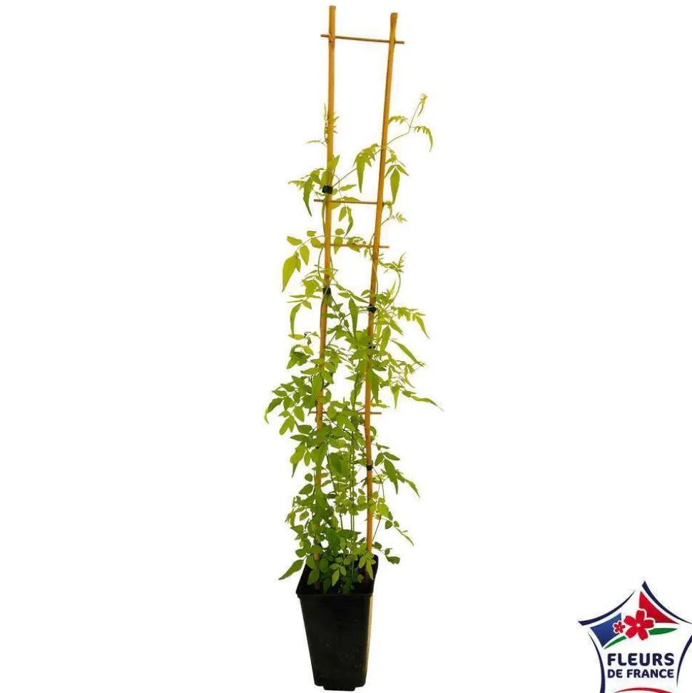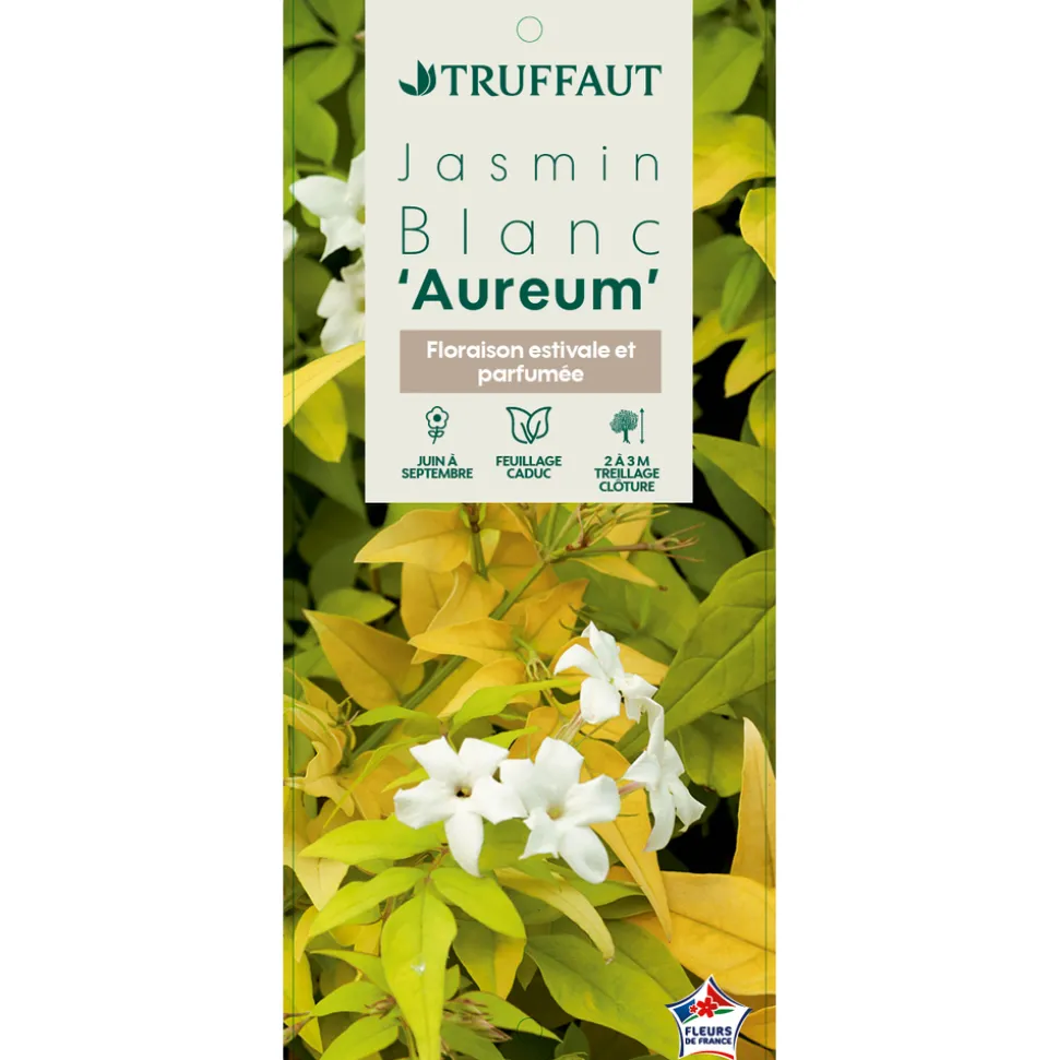 Introduit en Europe au 16ieme siècle, le jasmin officinal est certainement le jasmin blanc le plus rustique, supportant d’être installé en pleine terre dans de nombreuses régions à condition que les gelées soient de courte durée. Ailleurs, on le cultive en bac à rentrer hors gel en hiver. On est séduit par son feuillage semi-persistant et léger qui se couvre tout l’été de bouquets de fleurettes étoilées blanc pur faisant suite à des boutons floraux rose foncé. La floraison abondante et puissamment parfumée en fin d’après-midi, surtout lorsqu’il fait chaud, embaume l’air plusieurs mètres à la ronde. Cette grimpante arbustive vigoureuse, à croissance rapide, supporte bien la taille qui permet de la maintenir à des dimensions modérées lorsqu’elle est cultivée en bac. Elle se hisse au support avec ses fines tiges volubiles qu’il suffit de guider de temps en temps. Le jasmin officinal a donné naissance à des variétés intéressantes dont ‘Aureum’ qui se distingue du type par son feuillage doré.