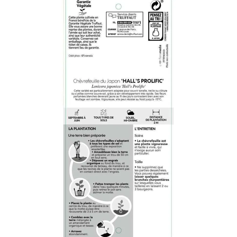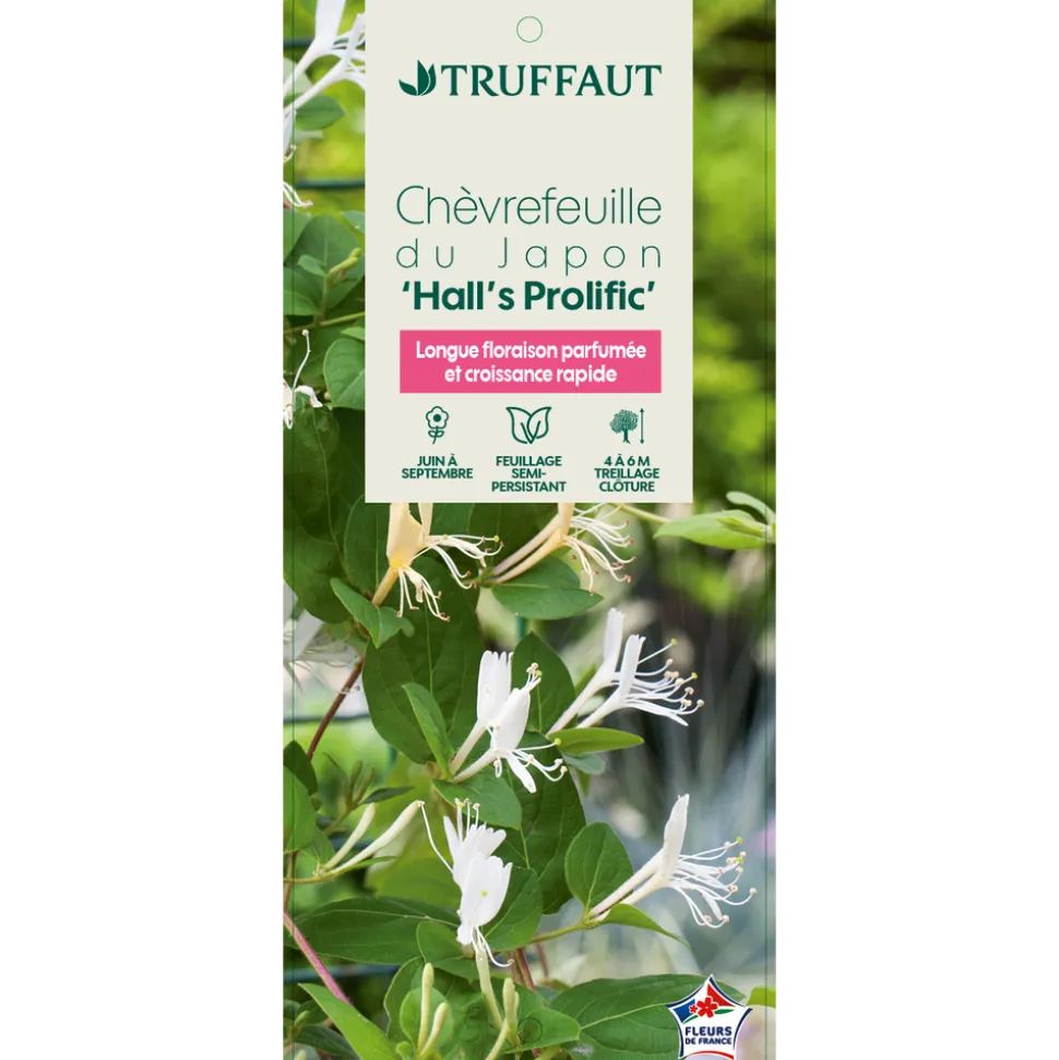 Le chèvrefeuille du Japon, Lonicera Japonica, est une des espèces les plus répandues dans les jardins. Cette liane vigoureuse à croissance rapide, s’accroche seule à son support avec ses tiges volubiles. Elle offre un feuillage semi-persistant vert sombre et luisant décoratif toute l’année. La plante fleurit abondamment et sans interruption tout l’été sur les pousses de l’année. Les fleurs, de 3 à 5 cm de diamètre sont très parfumées. Leur teinte blanc crème devient plus jaune au fil des jours. Elles sont suivies de baies noires toxiques. La variété ‘Hall’s Prolific’ est une amélioration du type se distinguant par une floraison particulièrement longue, parfumée et abondante et une très grande résistance aux maladies.