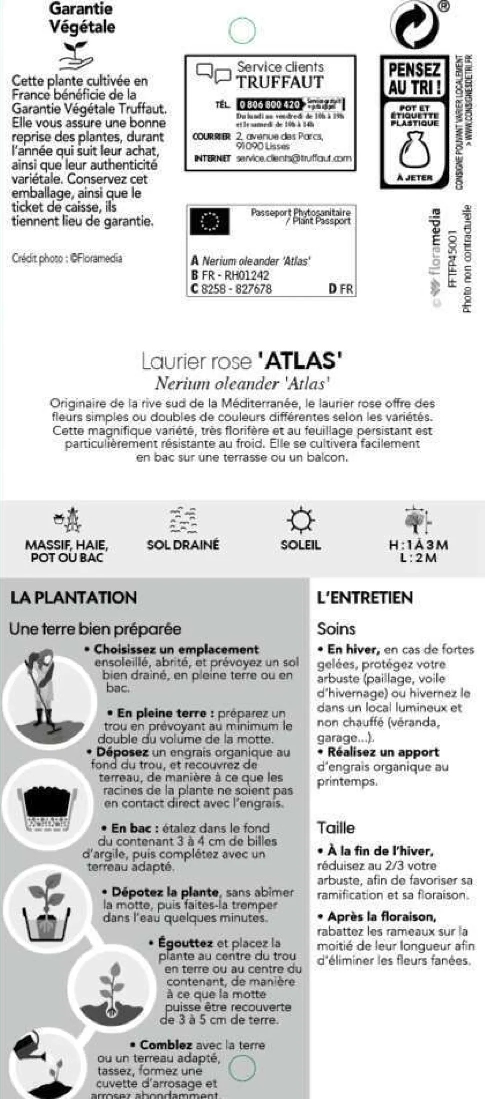 Nerium Oleander est un grand arbuste qui fleurit généreusement de mai à octobre. Les fleurs tubulaires à 5 pétales soudées sont groupées en cimes terminales au bout des rameaux. Il existe plus d’une centaine de variétés de Laurier rose, à fleurs simples ou doubles, parfois parfumées. Les couleurs de floraison peuvent être blanche, jaune, saumonée, rose, rouge, mauve. Le feuillage persistant est d’un vert légèrement gris, plus clair sur le dessous. Les feuilles simples sont opposées ou verticillées par 3. Elles sont lancéolées de 10 à 15 cm de long et pratiquement sessiles, directement attachées sur les rameaux. L’arbuste est ramifié dés la base, ce qui crée une touffe dressée assez dense de 2 à 4, 5 mètres de haut pouvant être utilisée aussi bien en haie libre qu’en plante isolée en bac. Laurier-rose ‘Atlas’ (ou Nerium rose simple) offre une jolie floraison simple de couleur rose clair dès le mois de Juin et ce jusqu’en Août ! Le Laurier rose ‘Atlas’ donne des boutons floraux plus foncés que la fleur épanouie. Son feuillage vert, allongé et persistant reste sur l’arbuste en hiver. Idéal en plein soleil pour une floraison plus abondante, le Laurier rose ‘Atlas’ aime aussi les sols drainés. Son principal ennemi l’hiver sera l’eau stagnante.