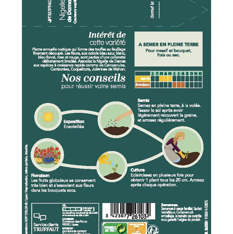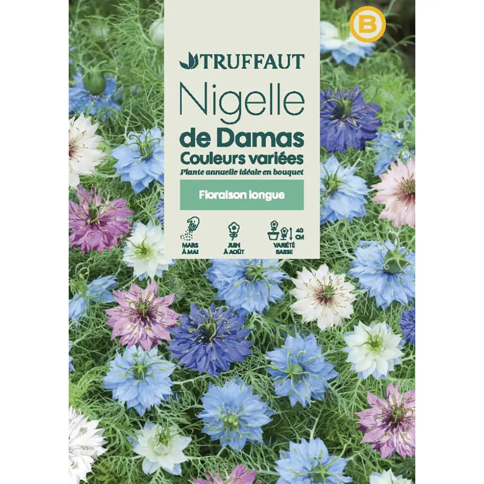 Ces graines de Nigelle de Damas mettront de l’originalité et de la couleur dans votre jardin. Elles vous donneront des fleurs en touffes de couleur bleu azur, bleu foncé, blanc, rose et rouge. Dotée d’une collerette délicatement brodée, cette variété aux tiges ramifiées et au feuillage finement découpé habillera vos massifs avec élégance. La floraison très décorative des ces nigelles illuminera vos extérieurs. Vous pourrez également par la suite réaliser de superbes bouquets frais ou secs.