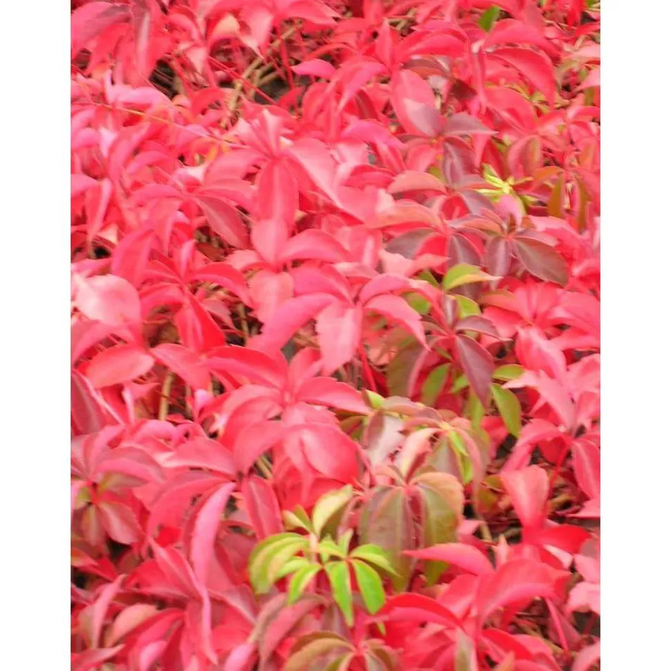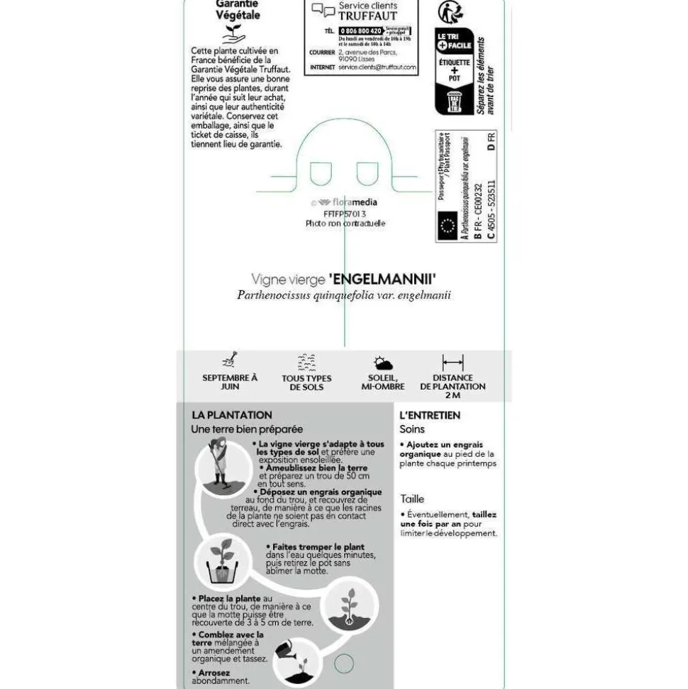 Grimpante (ou rampante) ligneuse très vigoureuse, à croissance rapide, Parthenocissus quinquefolia possède des vrilles non adhésives qui ne s’accrochent pas seules au support et nécessitent un palissage régulier. Ses feuilles sont composées de cinq folioles vert clair à revers plus glauque. En automne, elles se teintent de rouge sombre et d’orangé avant de tomber. Au cours de l’été, la plante produit des grappes de fleurs verdâtres insignifiantes, suivies de baies bleu noir brillant appréciées des oiseaux. La variété ‘Engelmanii’ se distingue de l’espèce type par des feuilles plus fines, des colorations automnales plus vives et des vrilles munies de ventouses qui lui permettent de s’accrocher seule au support.